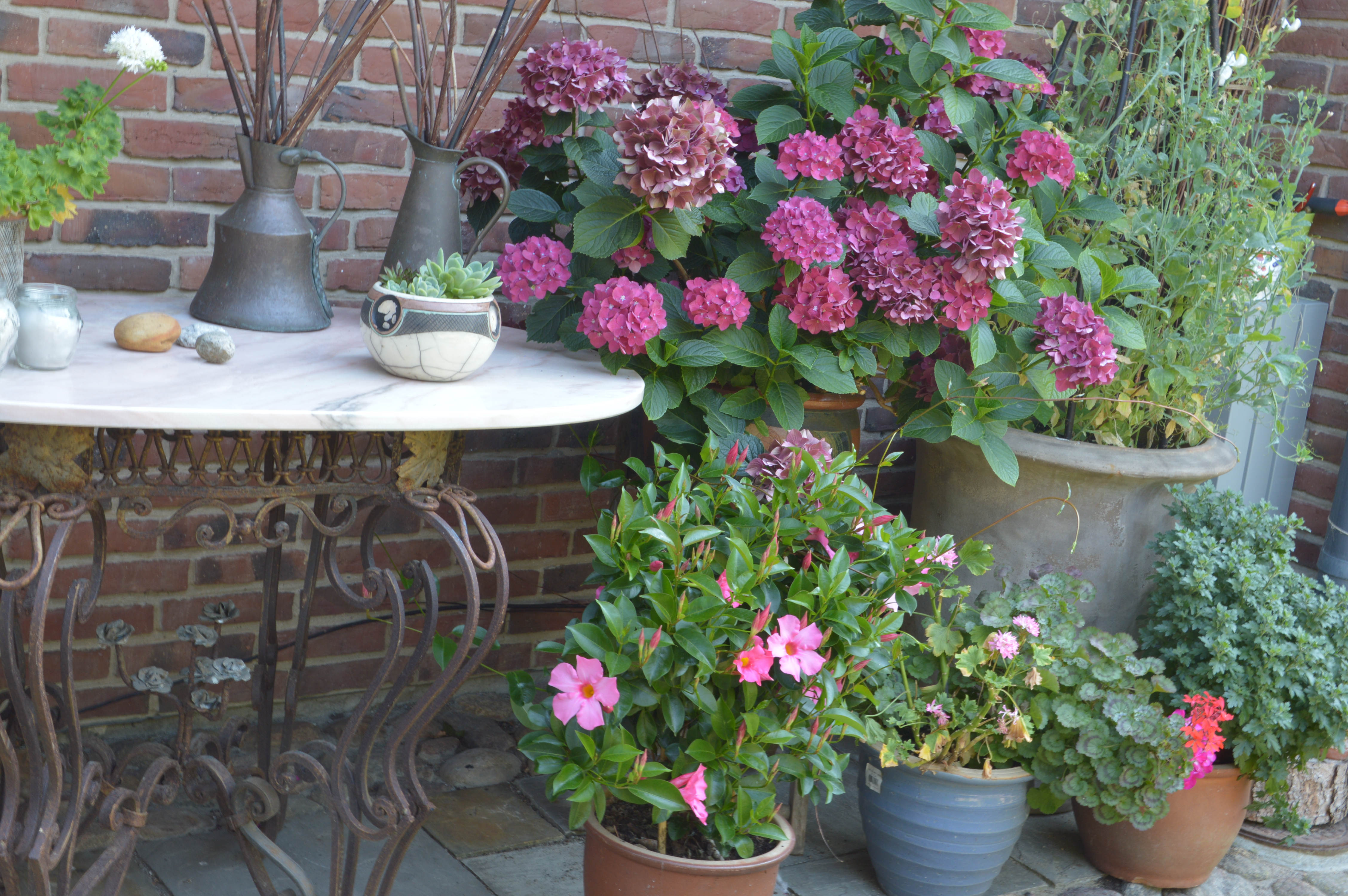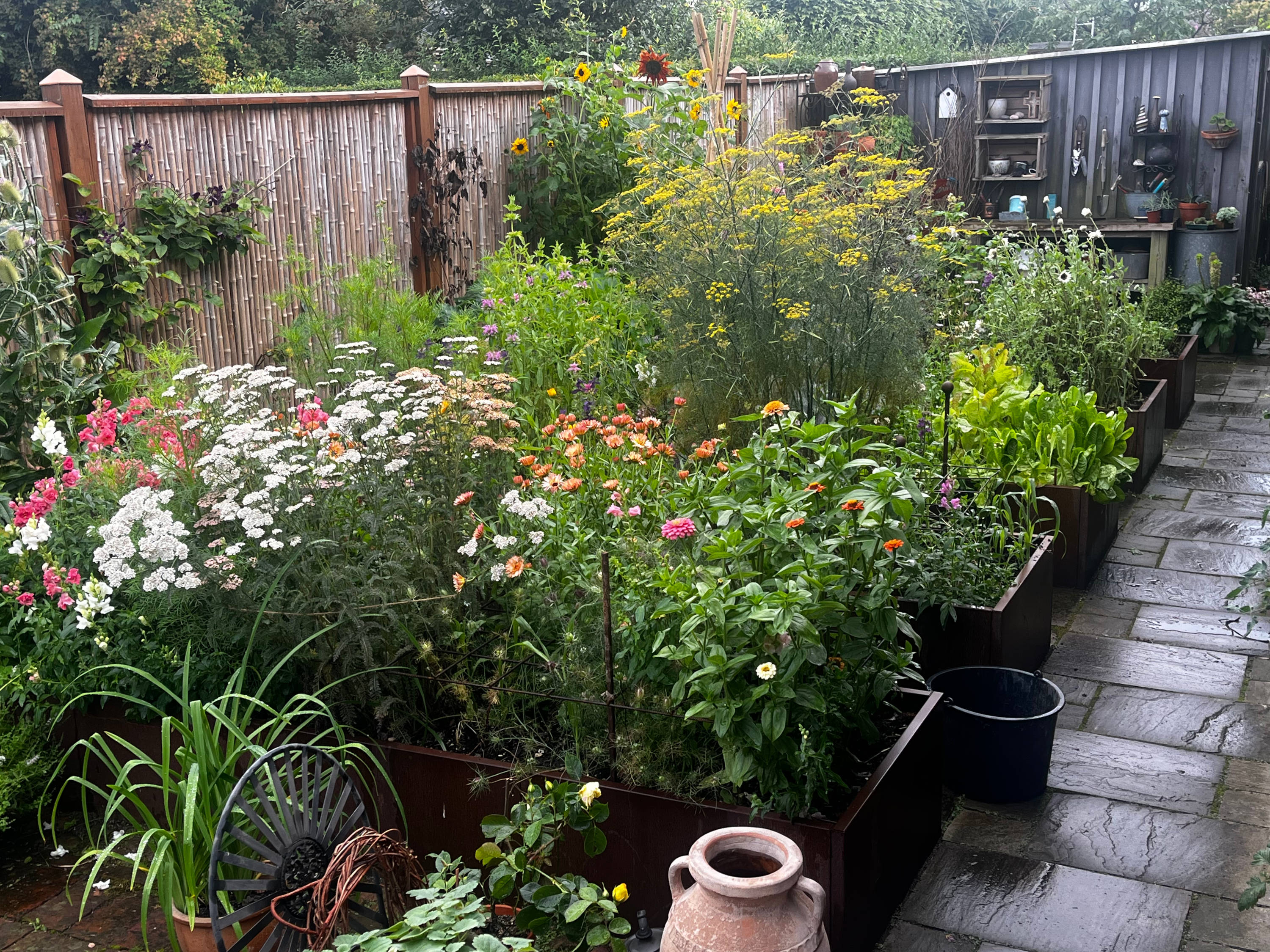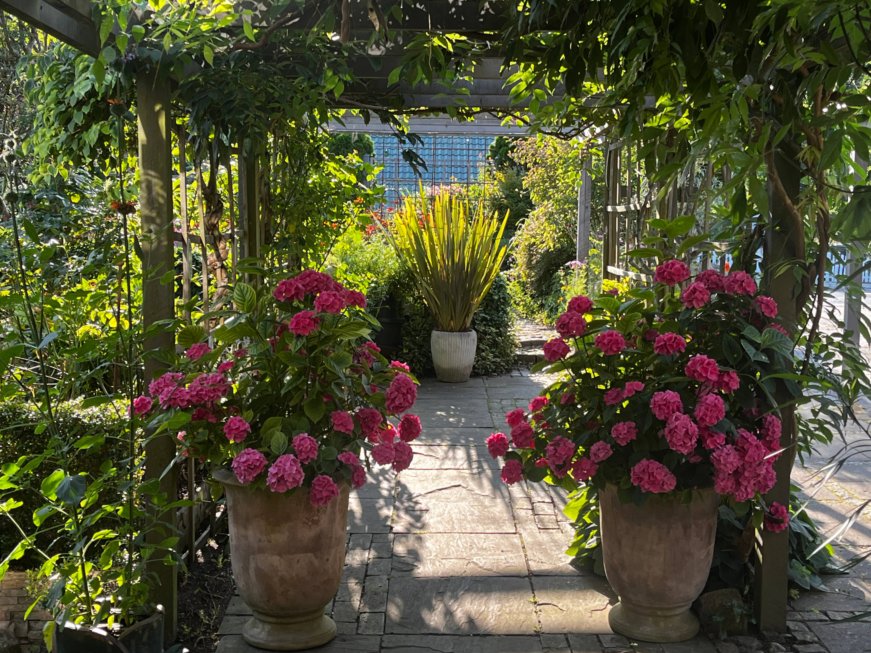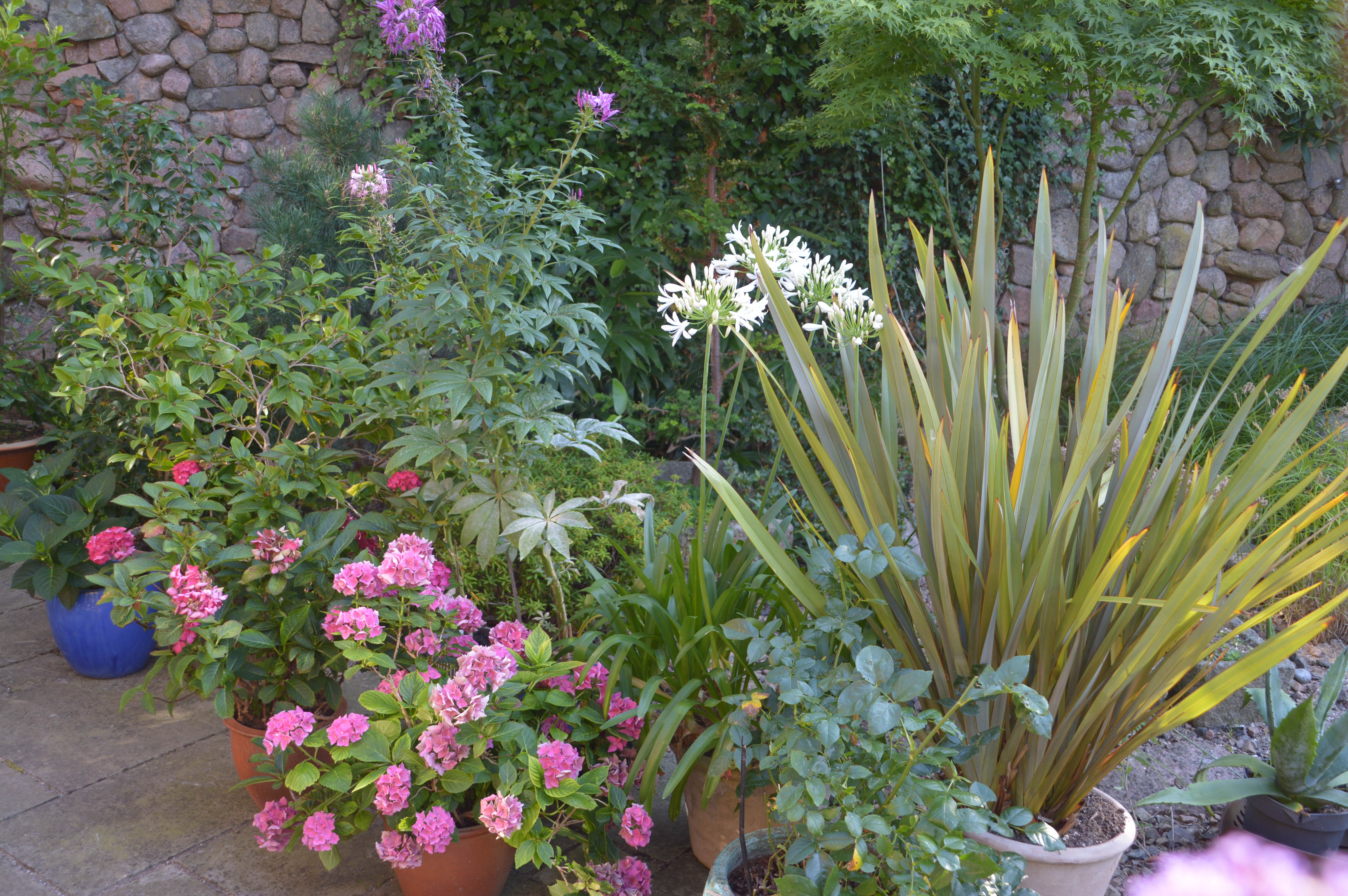 Haven indeholder bl.a. Stort Kenzobed Flere klynger af krukker med eksotiske planter Lille dam med fisk Orangeri Rosenbed Staudebede Stor niveauforskel i haven opbygget med høje stensætninger Højbede med skæreblomster og køkkenurter