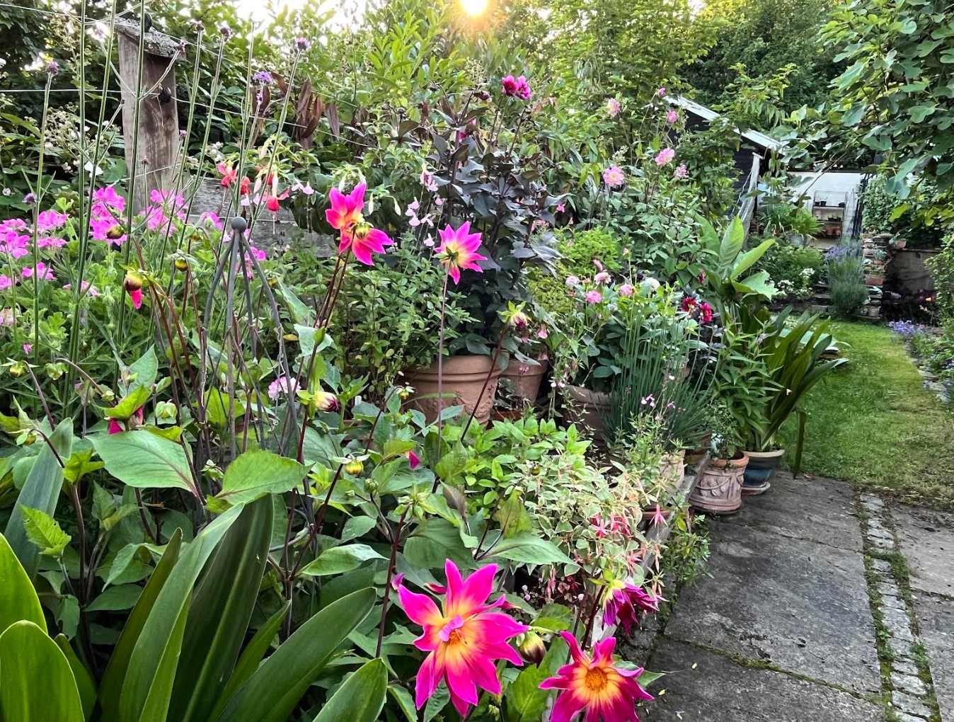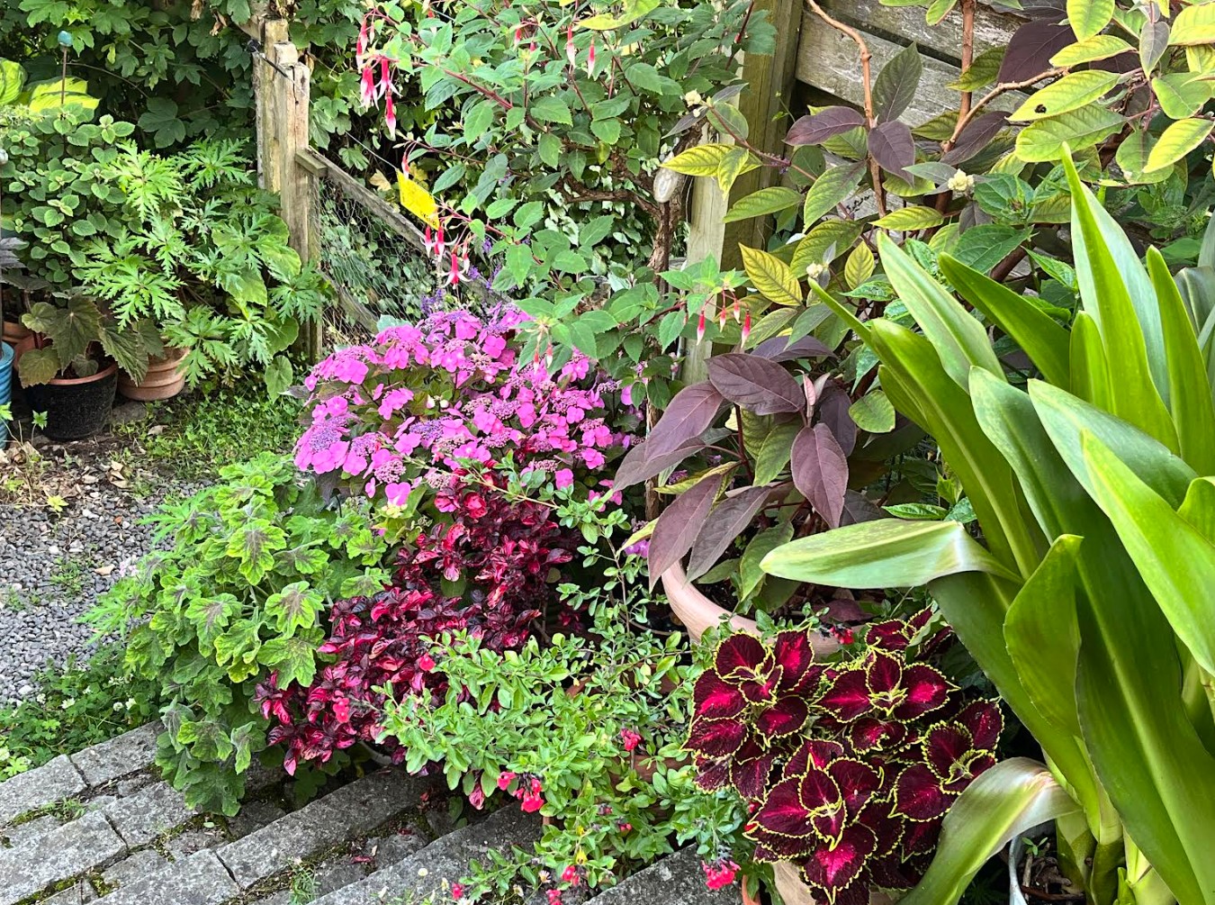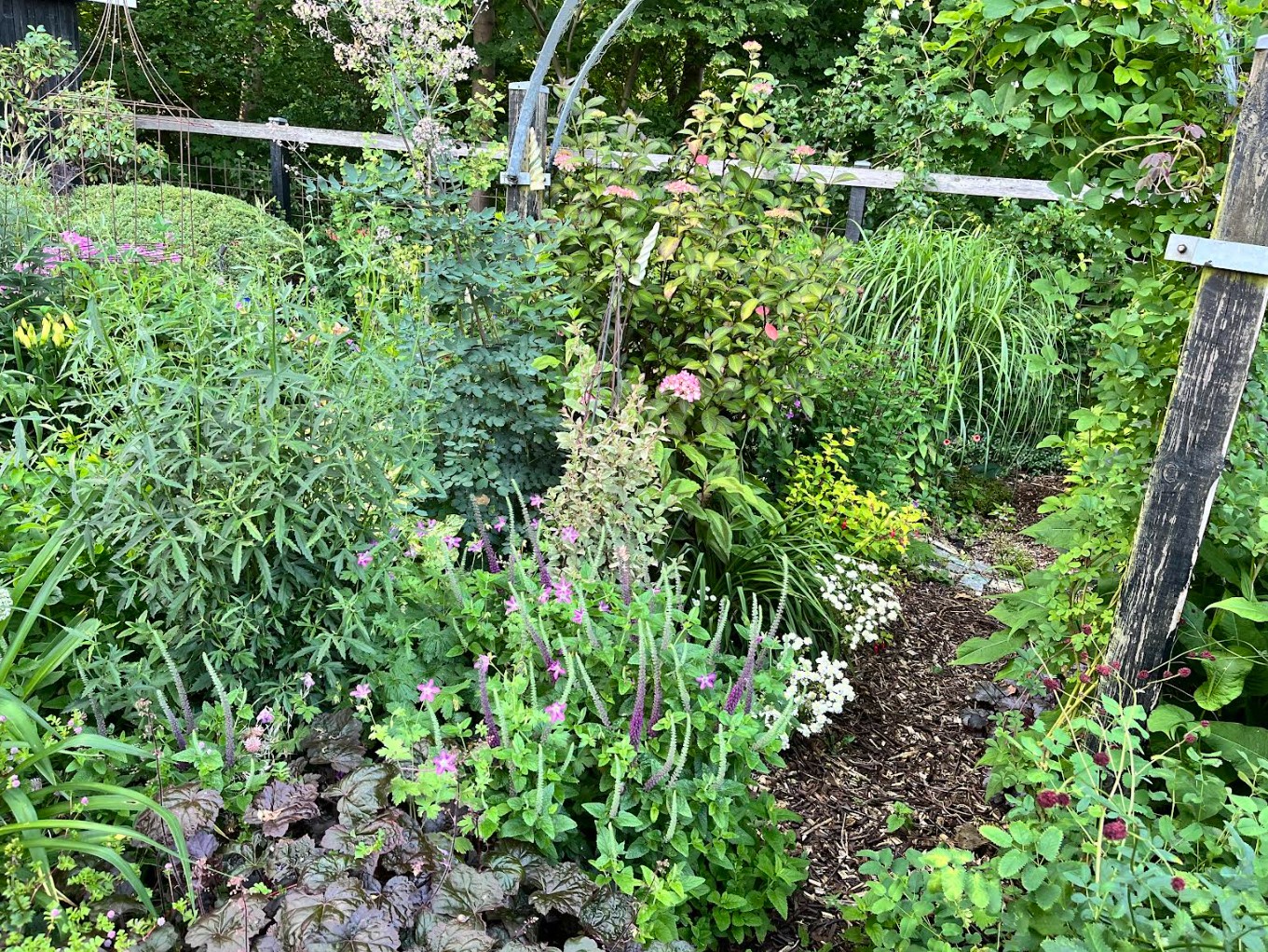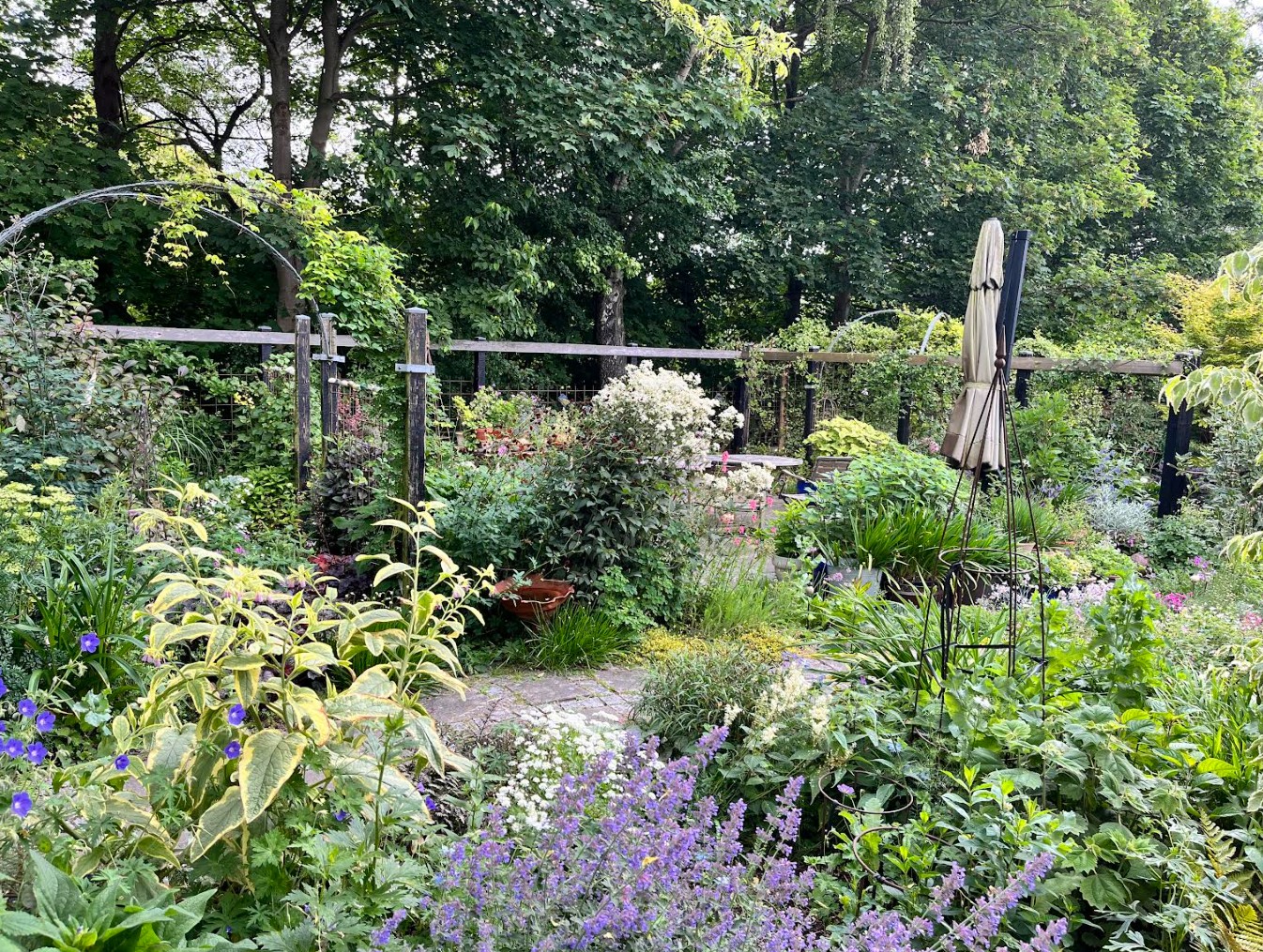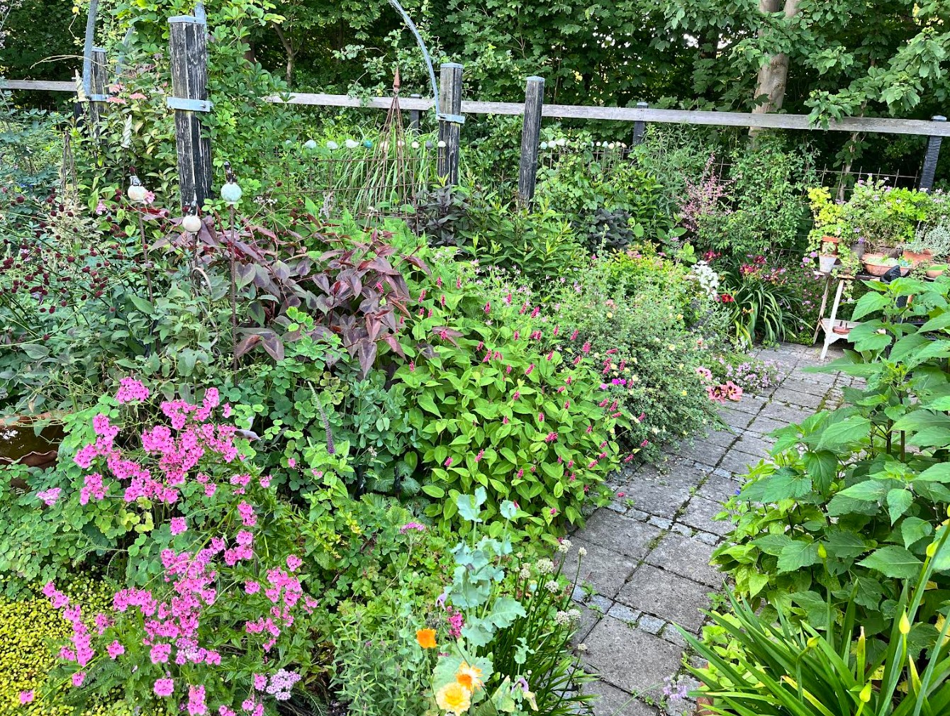 Veludnyttet og frodig have med fokus på blomsterbede og krukkevækster. Haven er udviklet over 25 år i takt med ejerens eskalerende have interesse og næsten al græsplæne er efterhånden omdannet til tætplantede blomsterbede, stier af forskellige materialer og terrasser pakket med krukker. I krukkerne findes bl.a. en stor samling af pelargonier, prydsalvier, skærmliljer, dahliaer, fuchsier og andre eksotiske planter, mange hjembragt fra haverejser. En afdeling indeholder et stort forsænket drivhus med guldfiskedam, højbed og espalierede frugtbuske. Haven dyrkes uden gift og er selvforsynende med kompost. Den er skabt med fokus på blomster og interesse året rundt, spændende løvfarver og forandringerne i vores vejrforhold. Jorden er sandet og dette muliggør plantning af sarte planter på friland, bl.a. cistus, santolina, småbladet pragtsalvier, mm. De seneste år er opgangen til huset gjort "vild med vilje" og haven tiltrækker mange insekter, padder og fugle. Alt i alt et overflødighedshorn af en have.