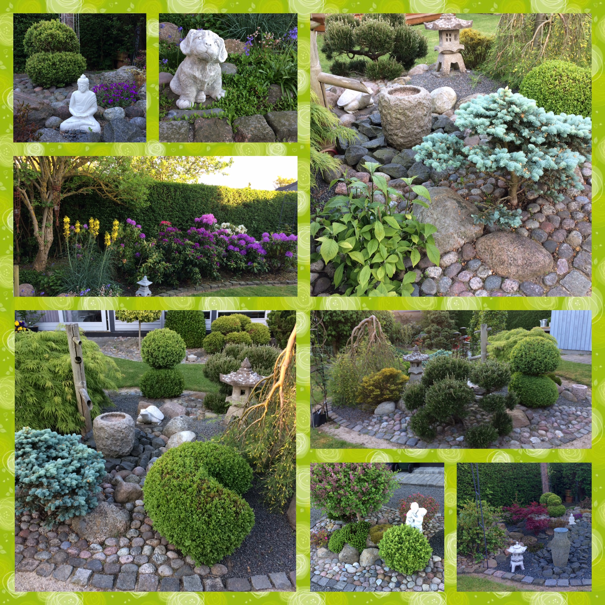 Prydhave med mange sten, formklippet buske og træer. Nyplantet stauder og figurer i haven.
