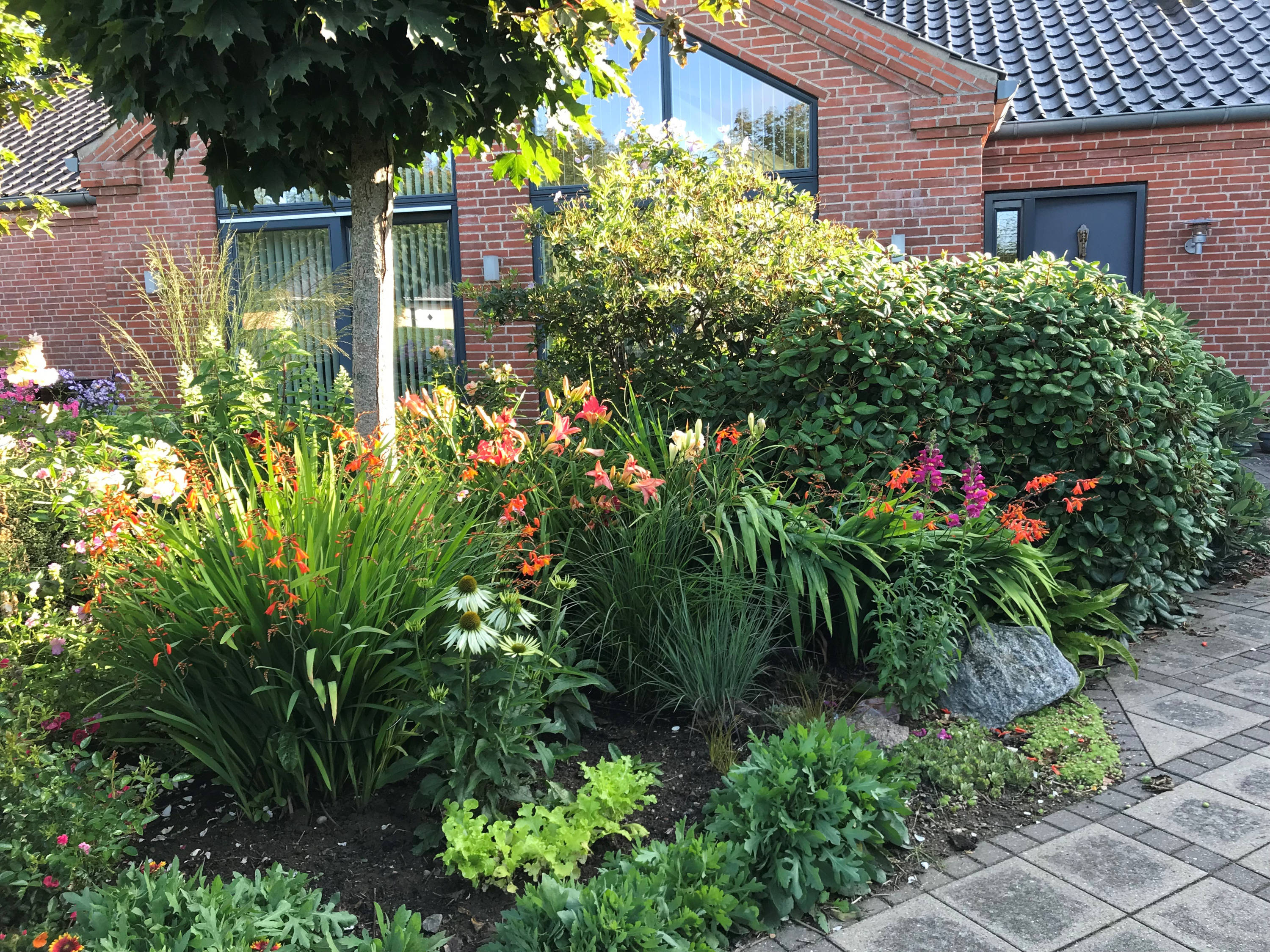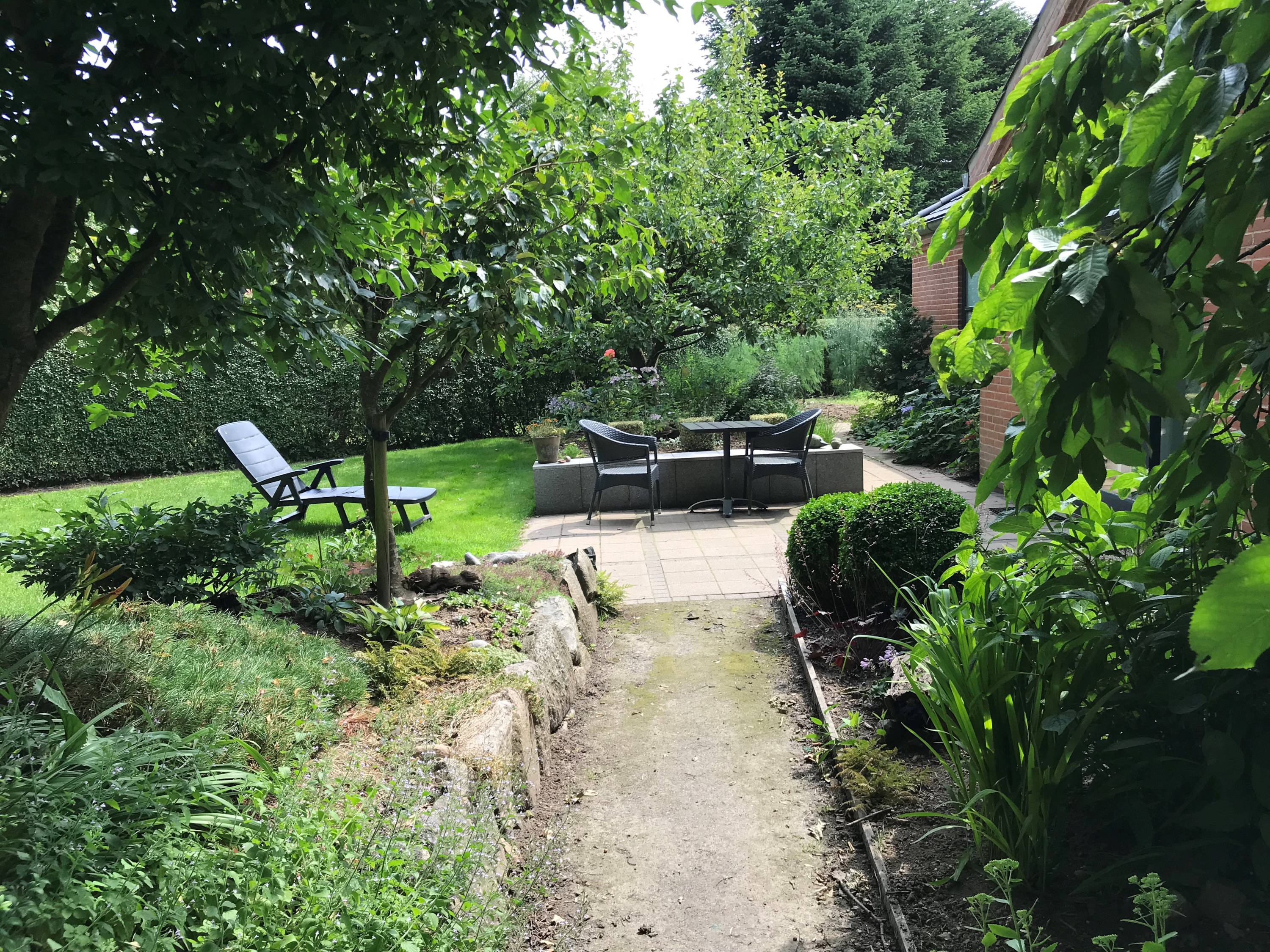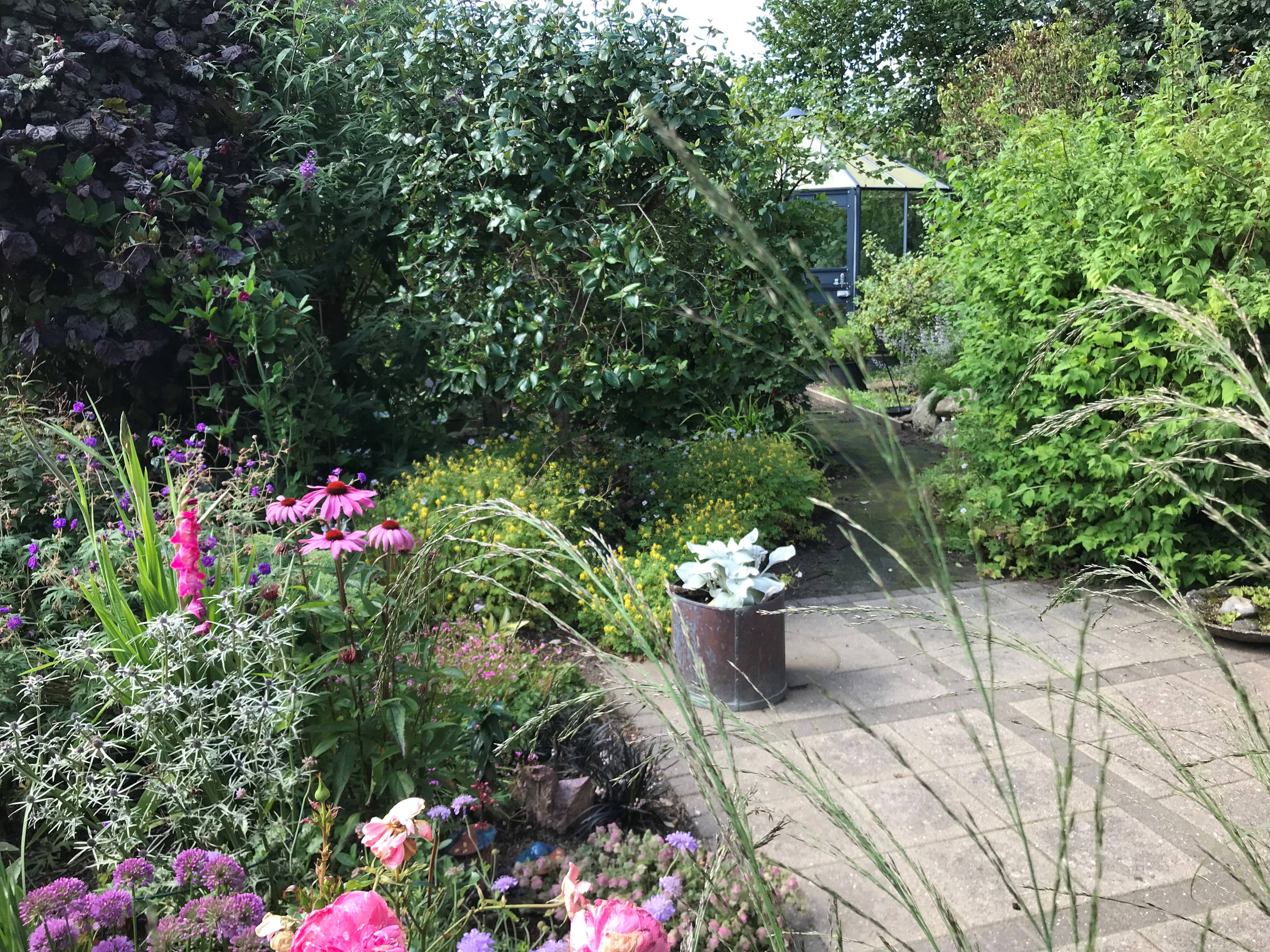 En have med mange planter,frugttræer,bærbuske og drivhus,og en meget lille græsplæne.Vi prøver også på at gøre haven til et godt sted for insekter og fugle