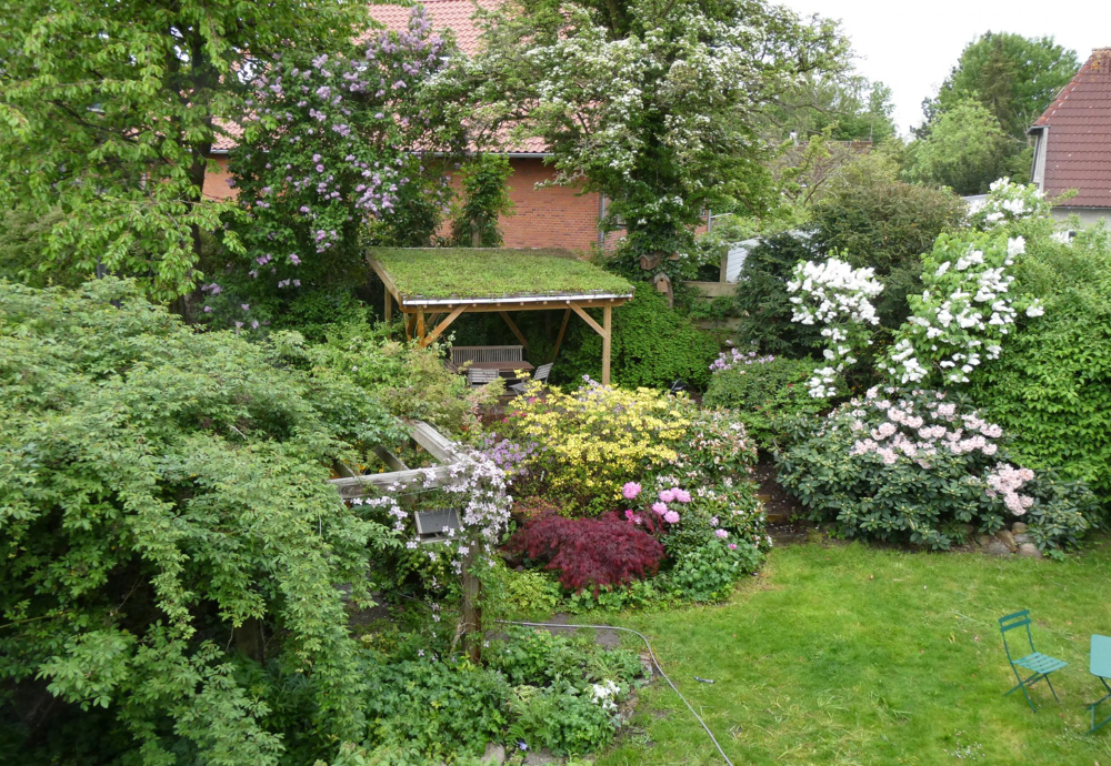 Haven overtaget 1986, siden sparring af 4 af havens konsulenter. Nu enkemand på 4. år og projektet er forenkling og tilpasning til mindre energi. Forhavens buksbom parterre netop erstattet af taks, som skjuler 1500 løg og senere 60 dahlia. Rosenhave med gamle roser og pergola med 30 år gamle klatreroser.. Rododendronhave med sedum-tag, staudehave, forsænket terrasse, arbejdshave med drivhus og potteplads, indre 3 meter hæk og forsænket teglterrasse.