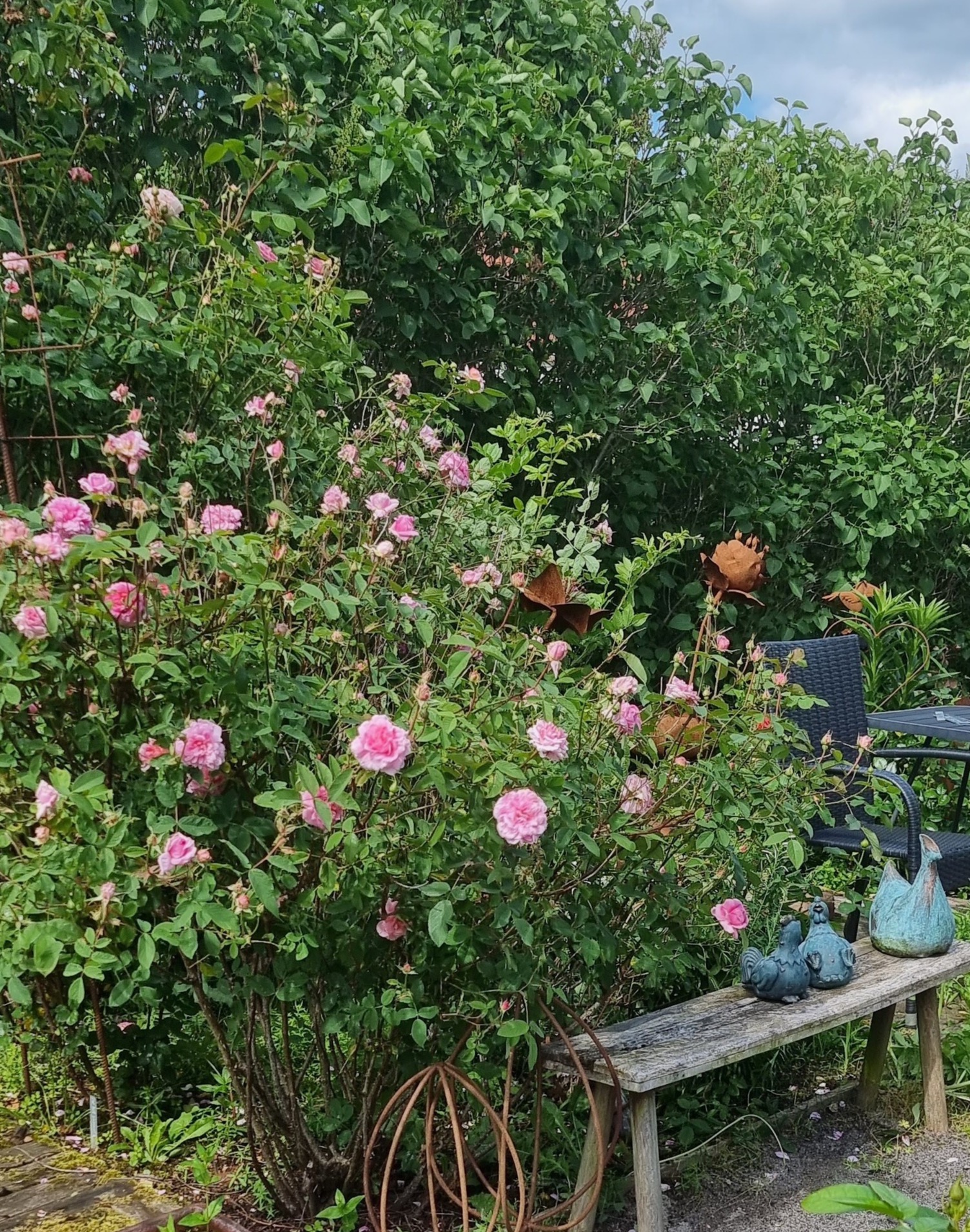 Oprindeligt skulle der kun være roser, men sådan gik det ikke:-). Nu er der også liljer, hosta og mange forskellige følgeplanter. Der er tænkt over farvesammensætningerne i de enkelte bede, og der er meget havepynt. Midt i haven står et kæmpestort 80-årigt valnøddetræ, som er perfekt at opholde sig under på varme sommerdage.