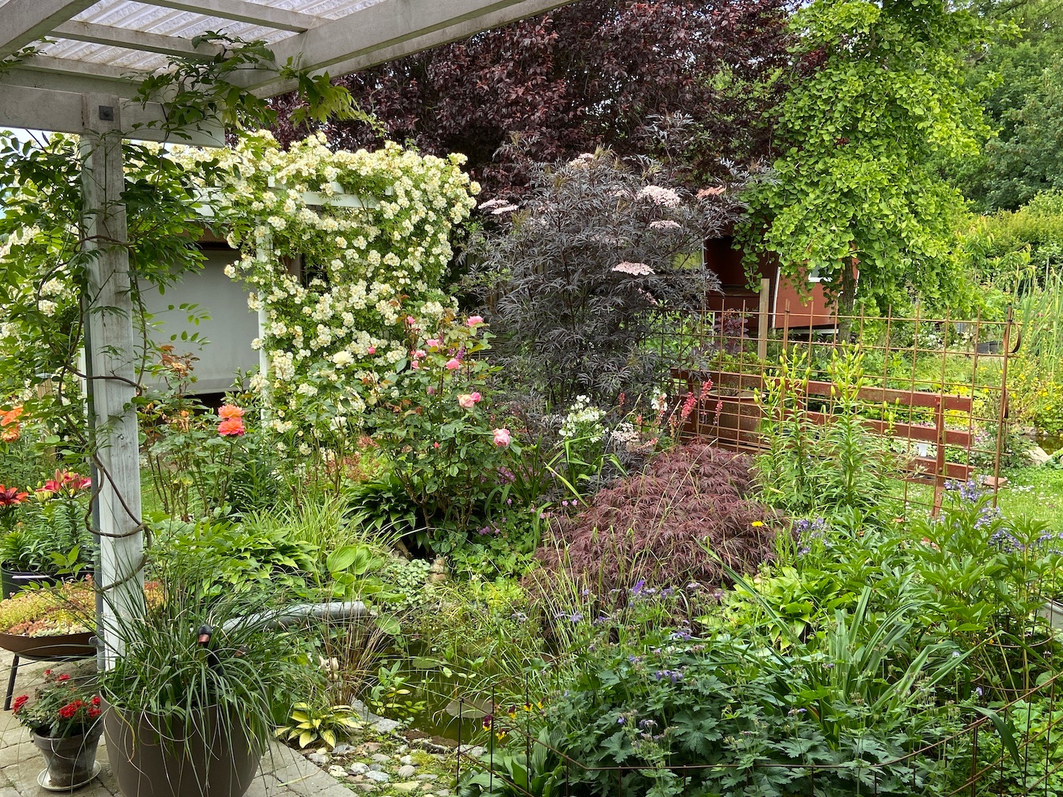 Mange roser, liljer og stauder. Havedamme og siddepladser. Der er kaffe og te på kanden.