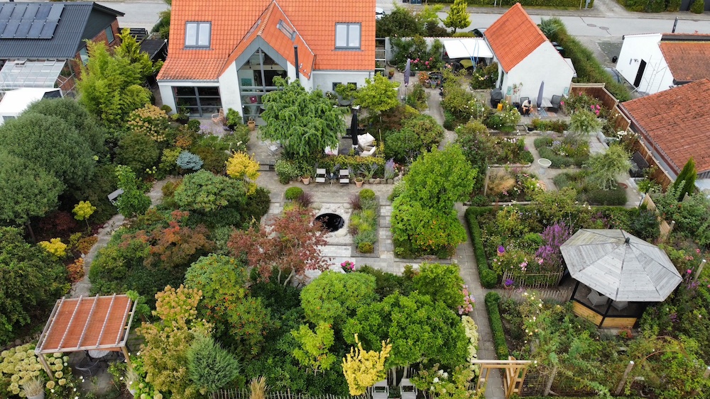 En parcelhushave der er inddelt i mange rum/temaer.