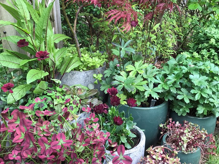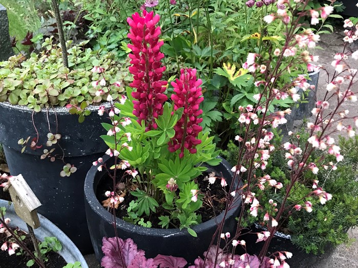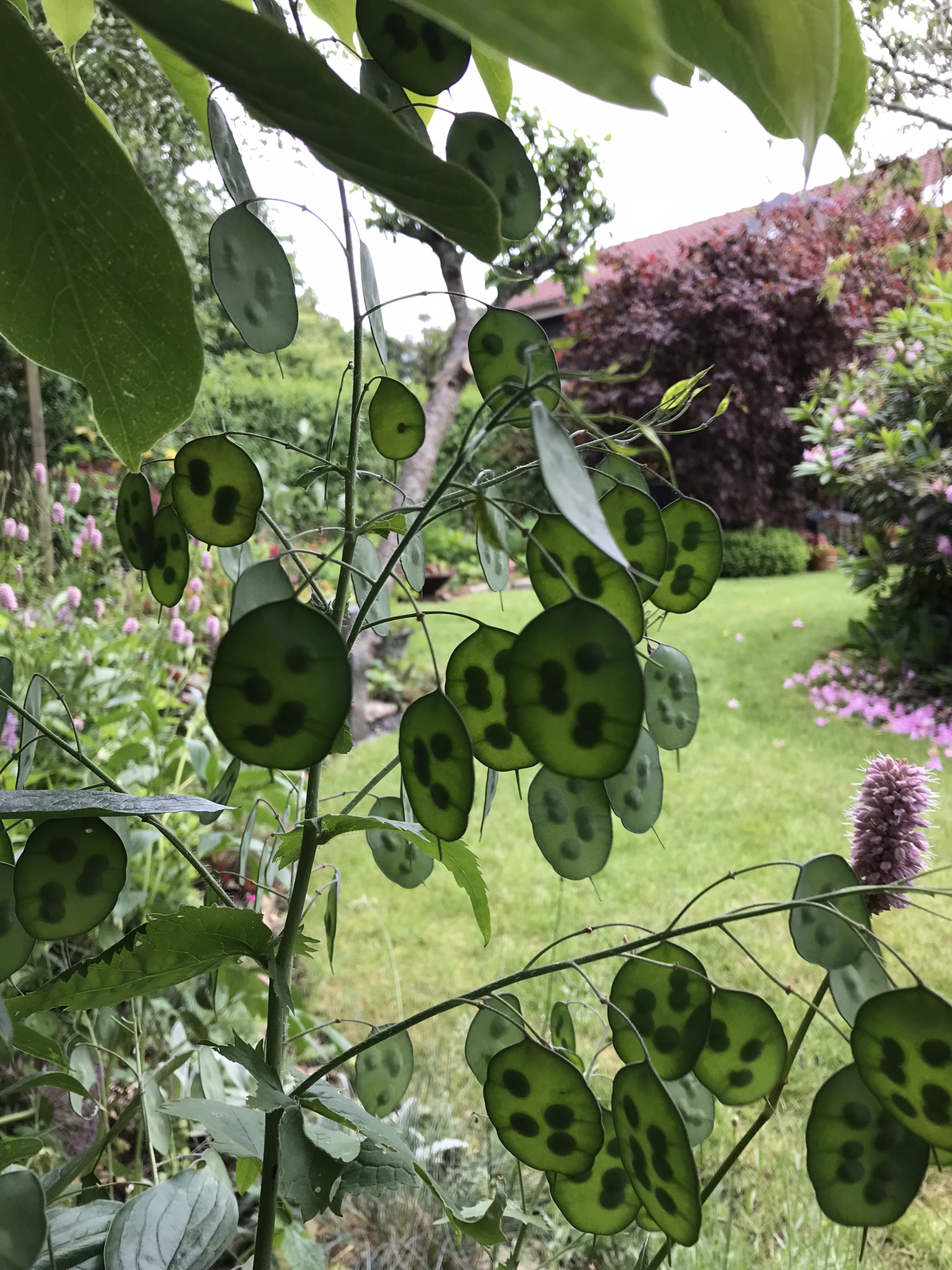 Haven har frodighed, er lidt ‘vild’ med træer, buske, blomster og stauder efter årstiden.