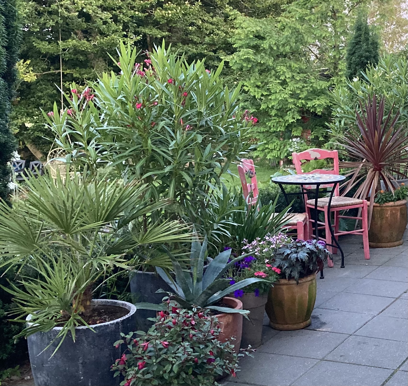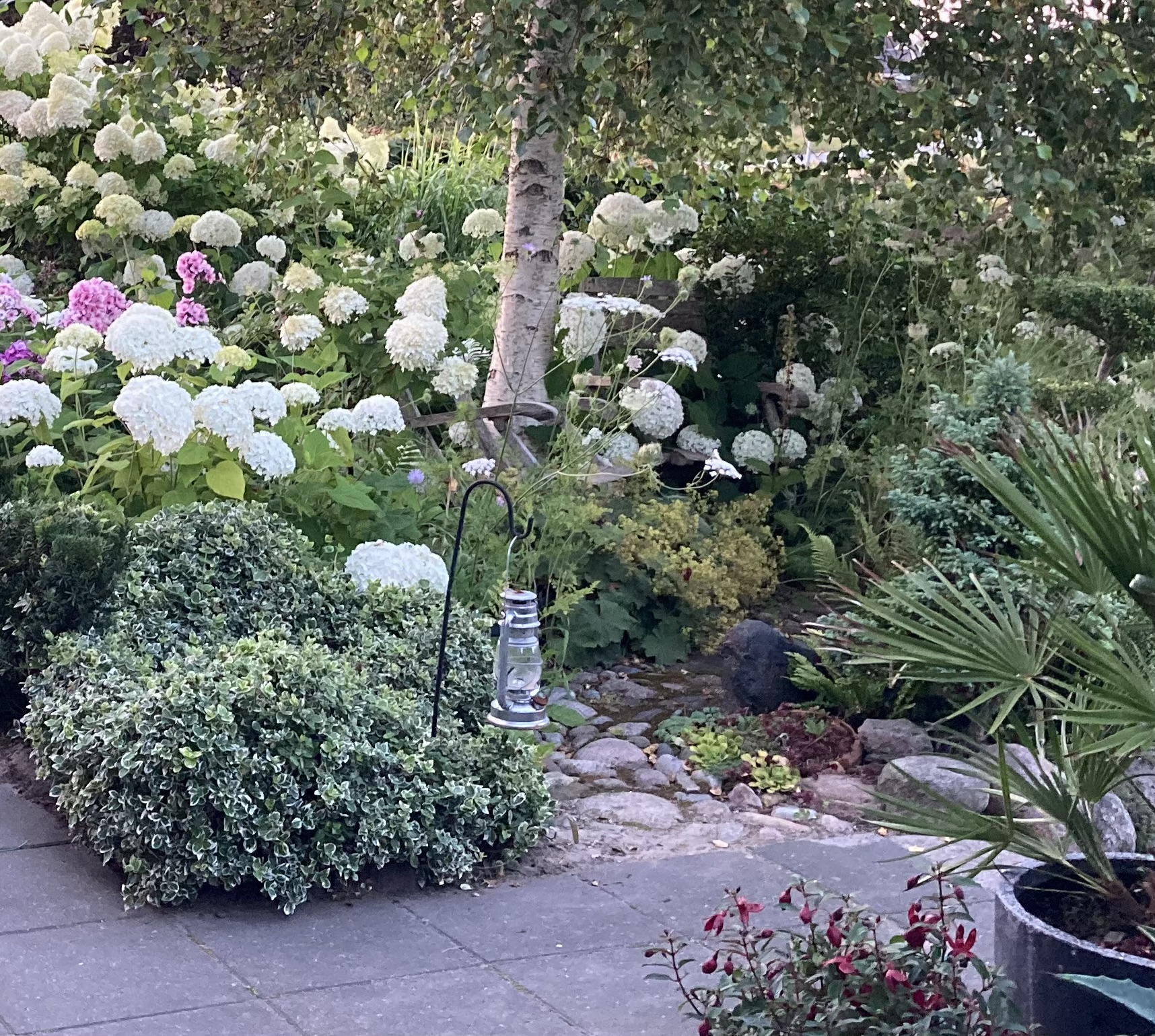Ung have, dog med store træer og formklippede stedsegrønne planter. Rosenterrasse og hyggelig middelhavs krukkehave med lyden af vand. Igang med nyt vandanlæg med sten og mindre vandfald