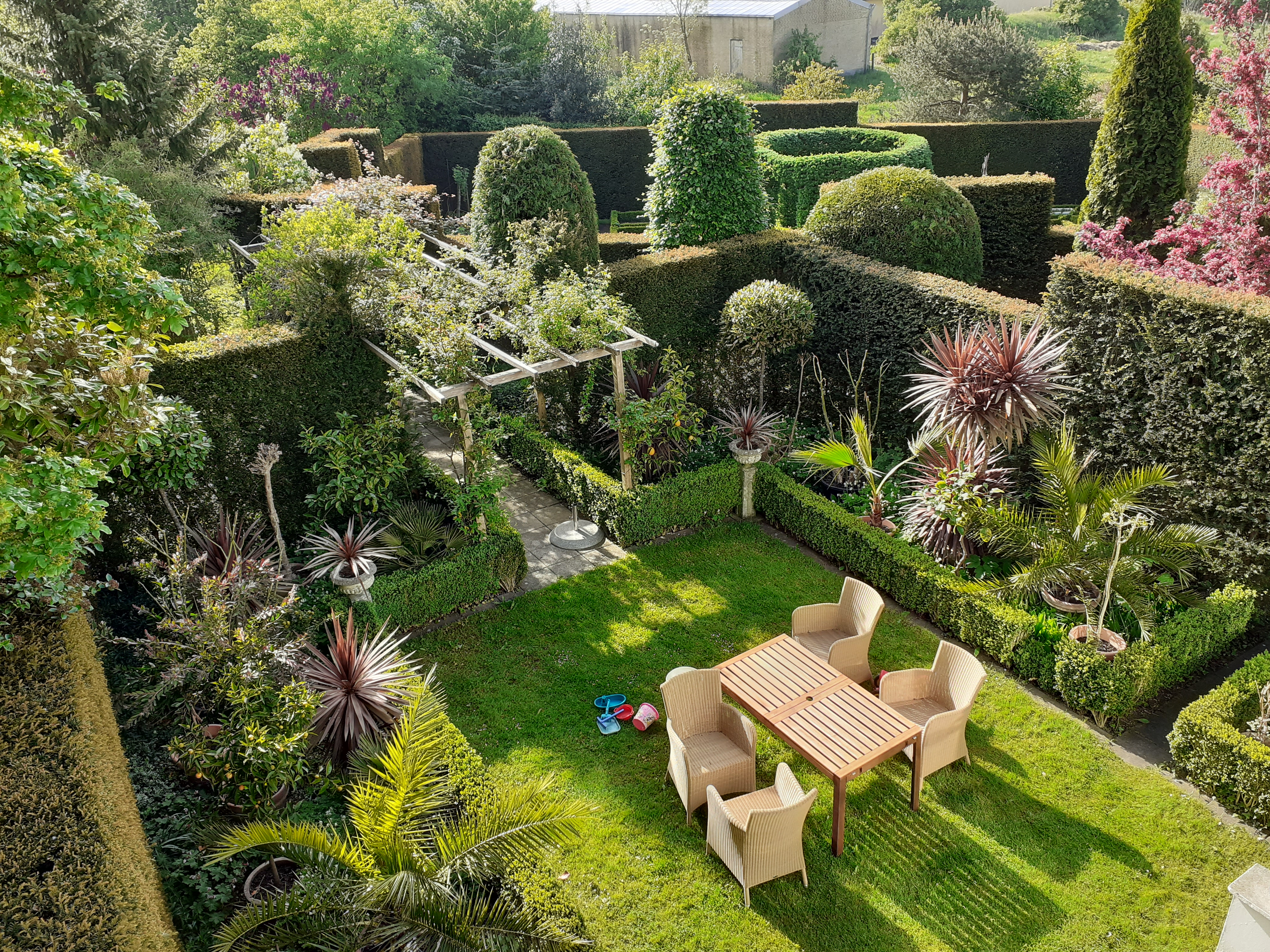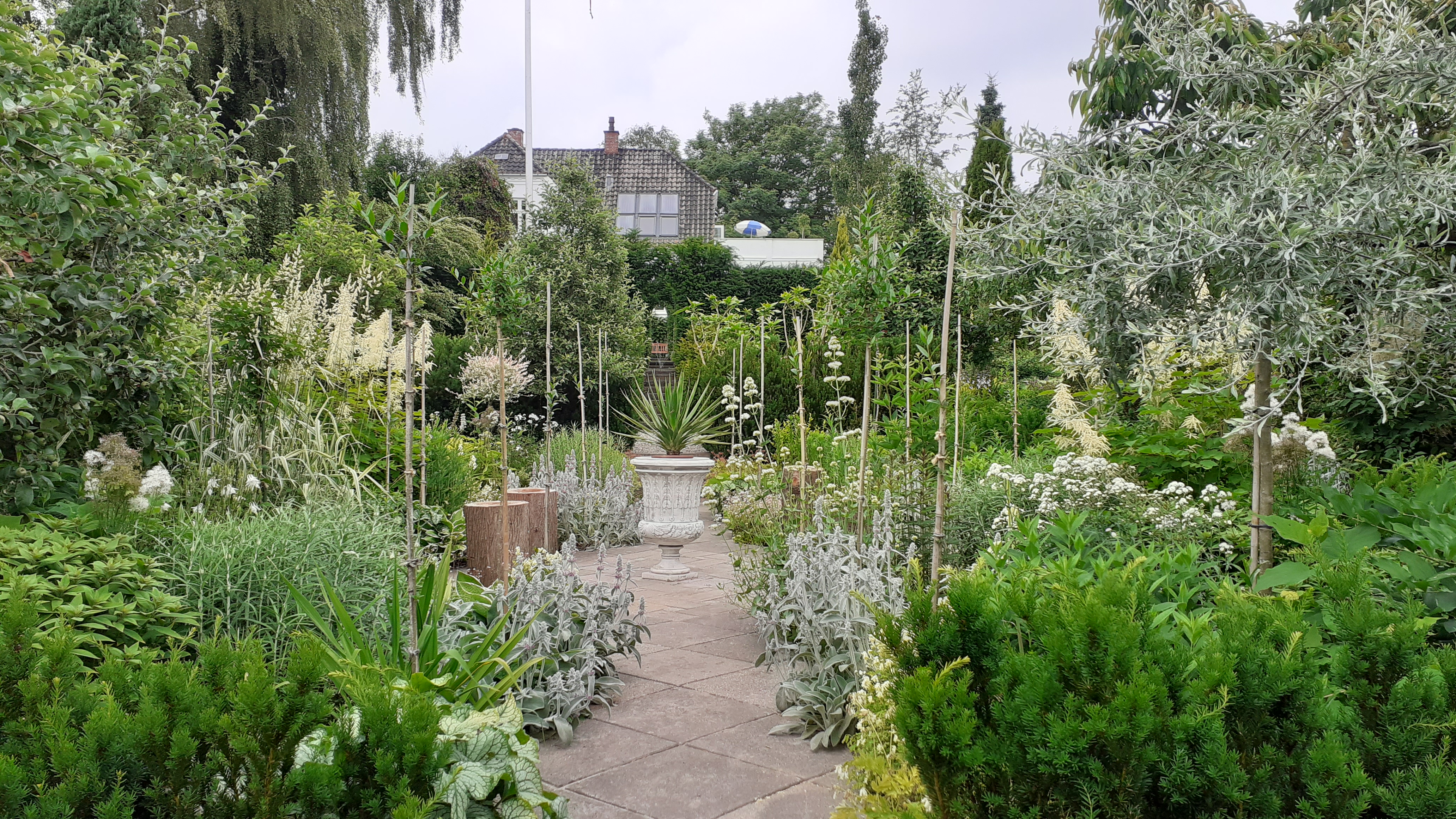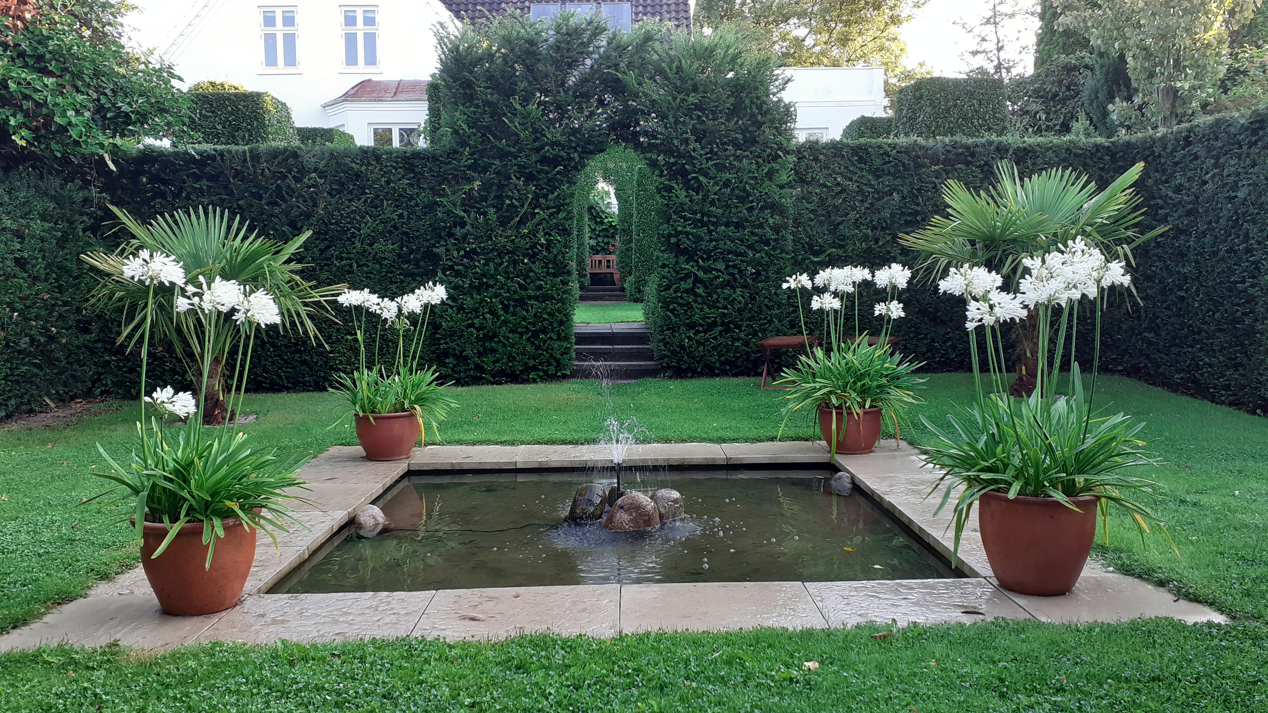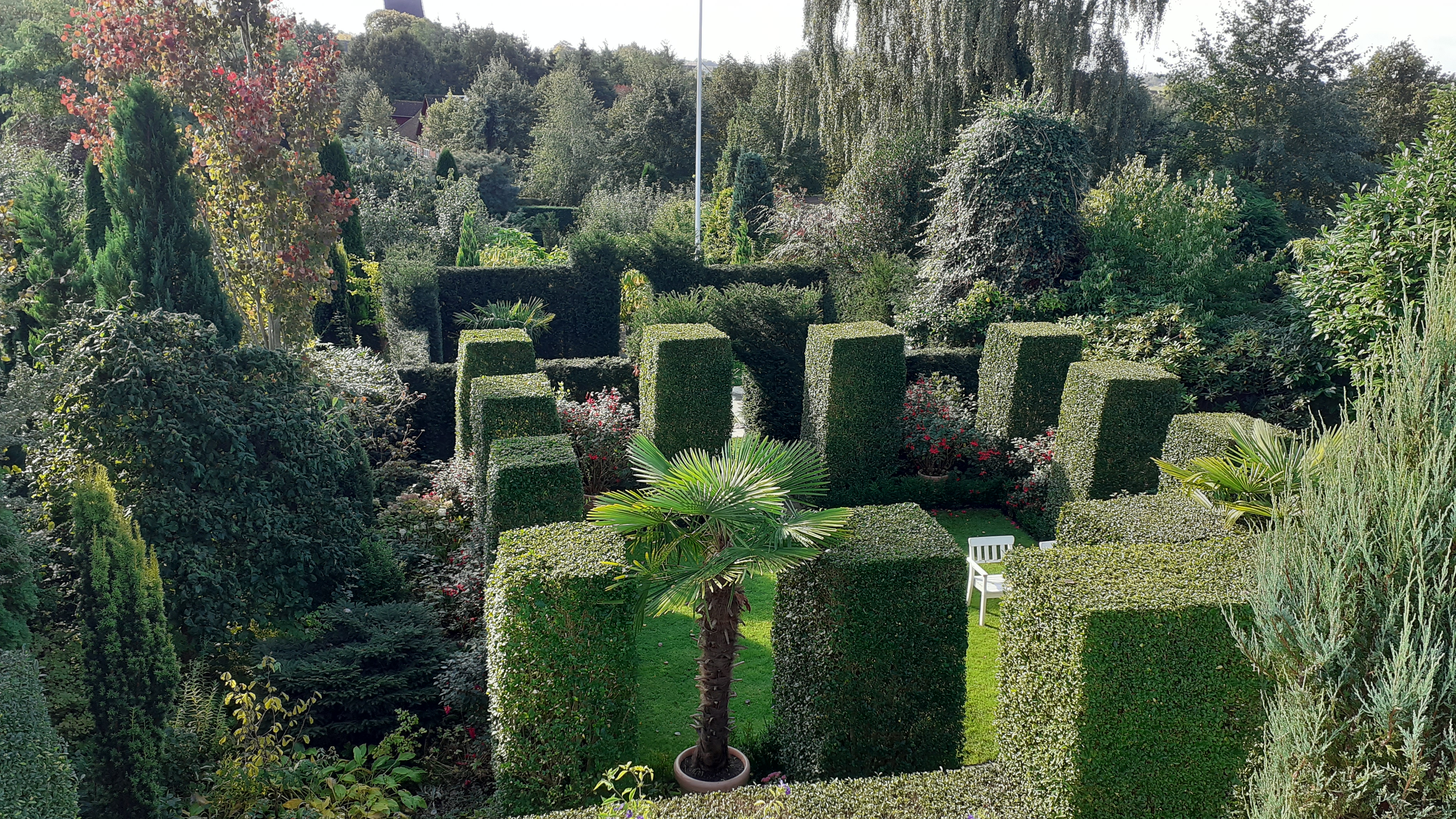 4000 m2 have med mange rum og lange kig, næsten alt græsset erstattet af buske og blomster og 120m2 staudebed i vejkant