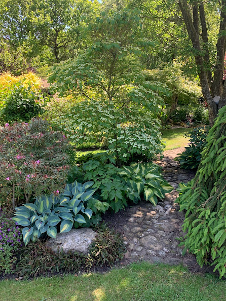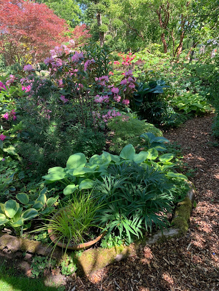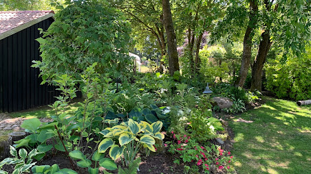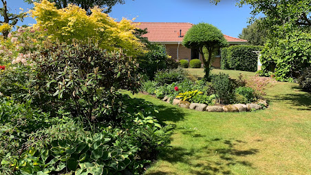 Villahave på 2.000/5000 kvm er under stadig fornyelse. Her er bede med rhododendron, farveinddelte bed med stauder, Stor samling af hosta, trillium og bregner. Sjældne træer og buske. bækløb og 2 søer. mange natursten og pikstenstier . En spændende have med mange smukke detaljer!