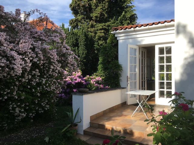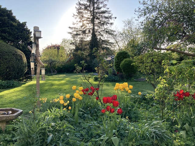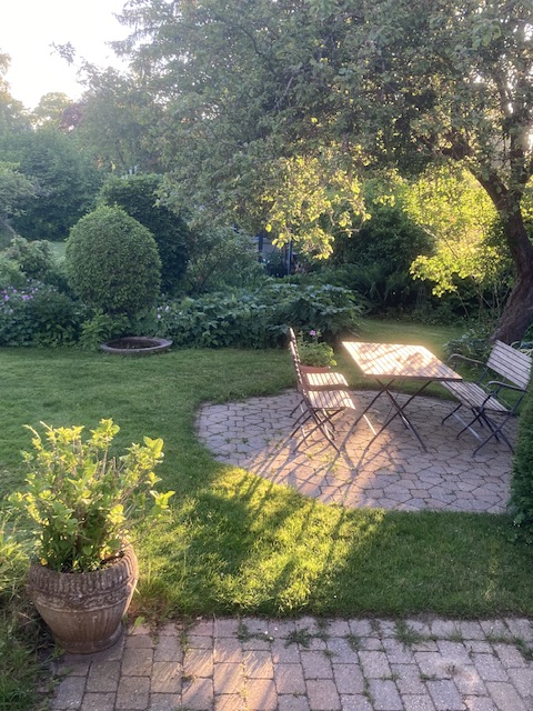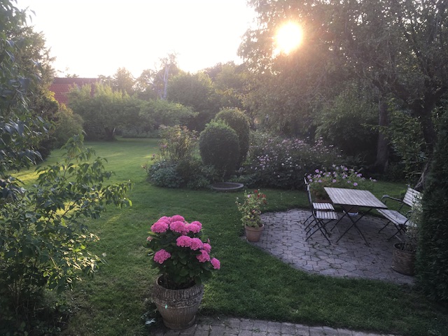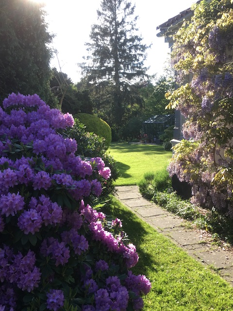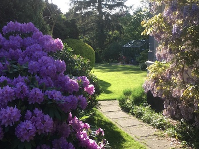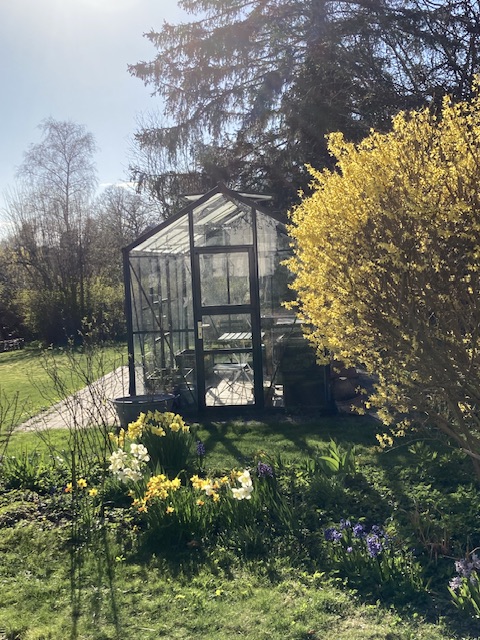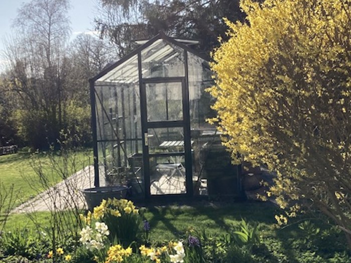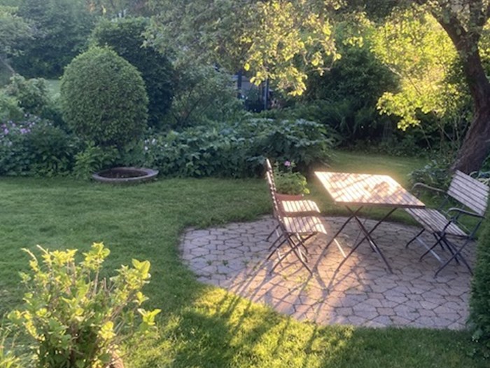 Stor gammel villahave, anlagt for ca 100 år siden med 9 år gammelt drivhus og nogle store, gamle stedsegrønne træer.
