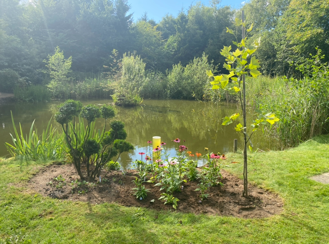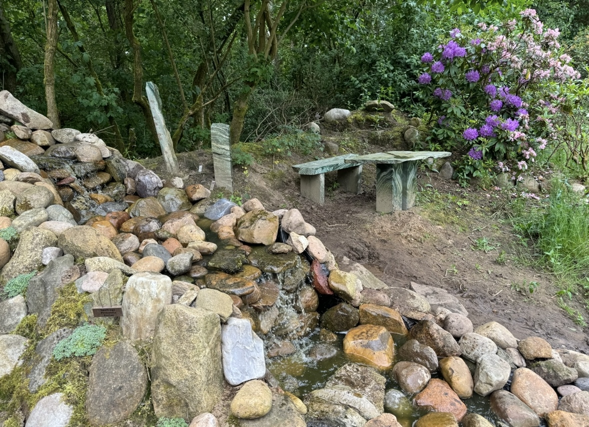 Haven rummer sø, vandfald, blomsterbede, pilehytte og meget mere.