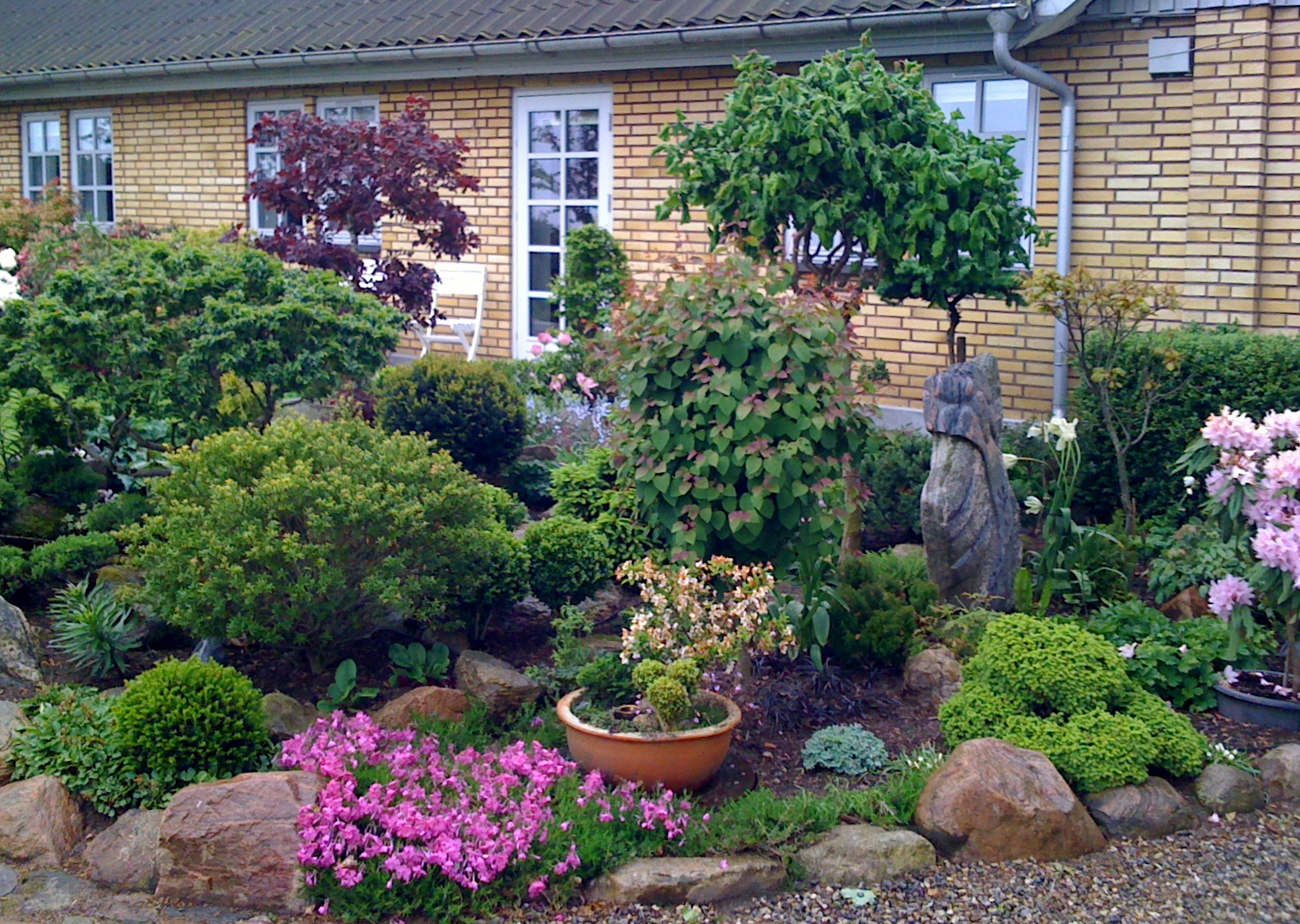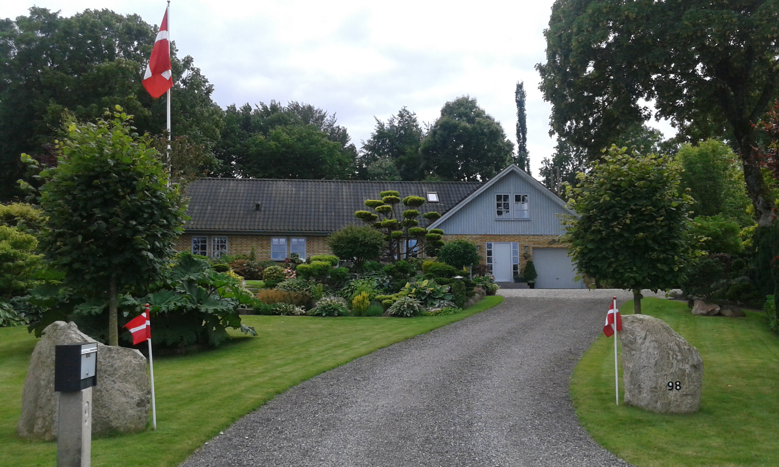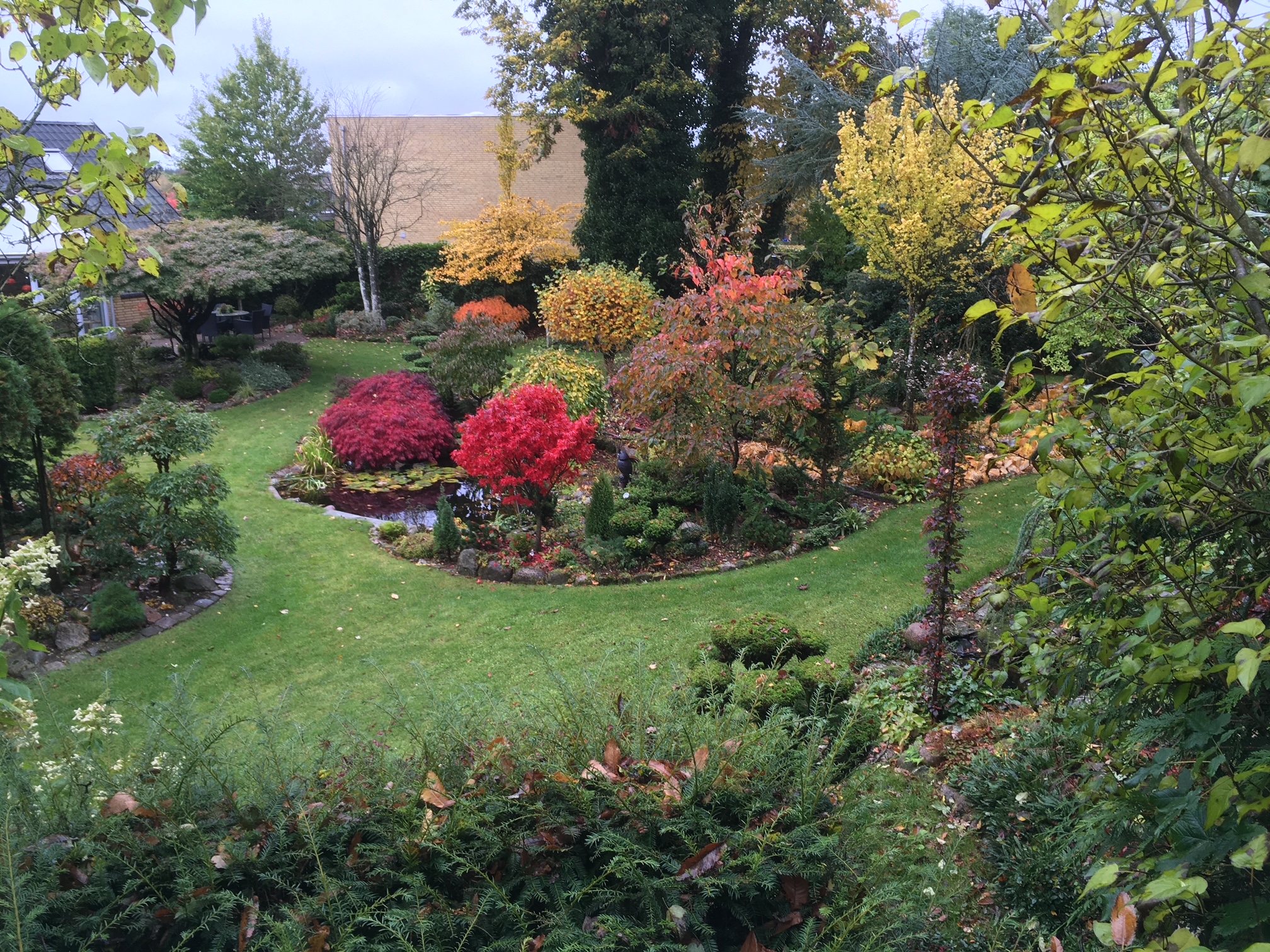"GAMMEL HAVE I BAKKET SKOVOMRÅDE BELIGGENDE I NY VILLAKVARTER". Haven på 4600 kvm er anlagt i bakket skovområde med en spændende indretning, hvor natur og haveanlæg forenes, så der er blevet plads til meget biodiversitet. I haven er der bede med rhododendron, bregner, hosta, og andre forskellige stauder og stenbedsplanter. Sten og træstammer samt trærødder er anvendt ved anlæg af de forskellige bede. Der er plantet en del sjældne træer og buske. Vi har flere træer og stedsegrønne, der er formklippede. Et vandparti er anlagt så terrænet er udnyttet til flere vandfald.