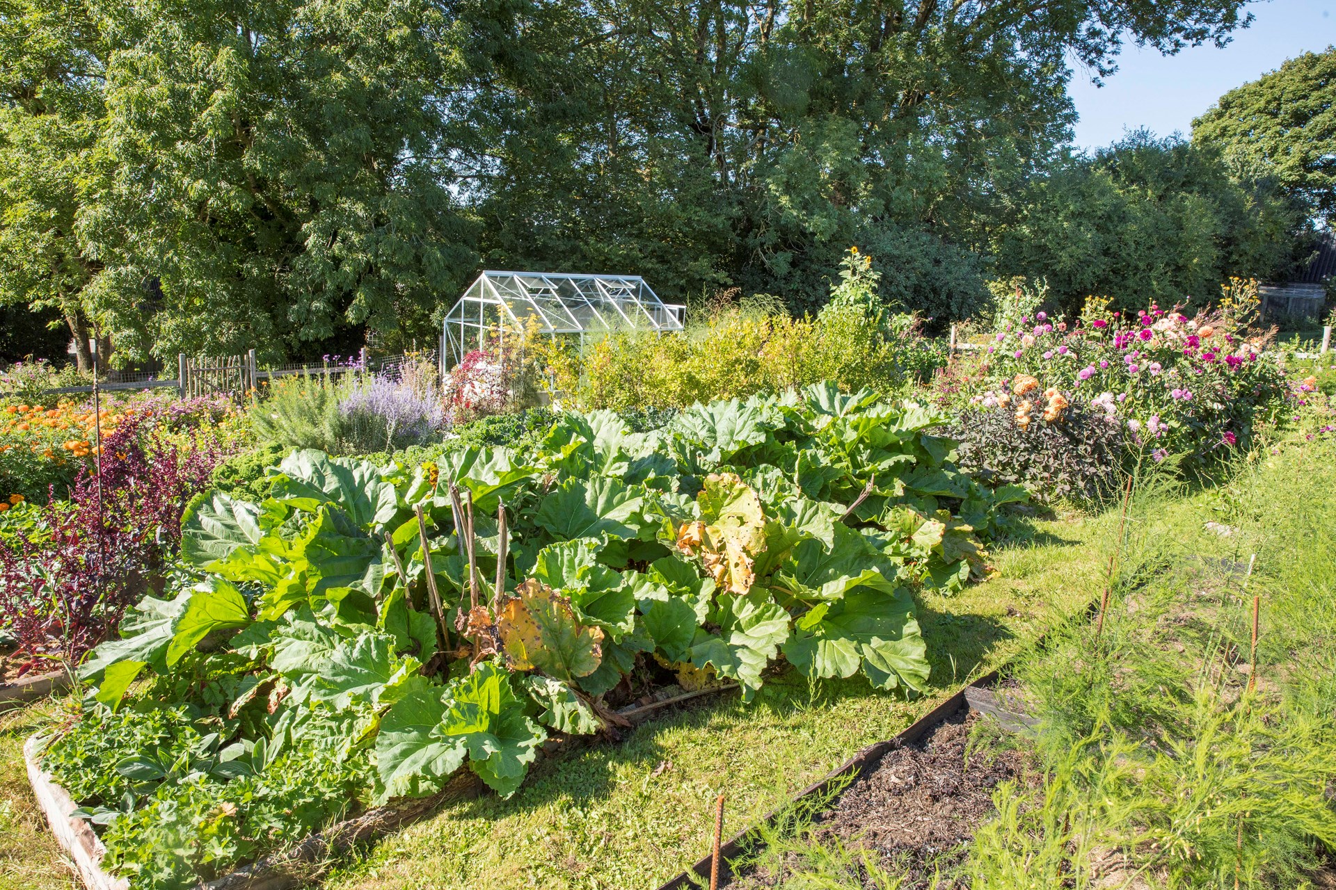 Højbedene bugner af alverden grøntsager, krydderurter og spiselige blomster. Der kan høstes bladgrønt det meste af året, og der syltes og fryses til den store guldmedalje, så familien bag køkkenhaven er tæt på at være selvforsynende med godt og grønt fra haven det meste af året.