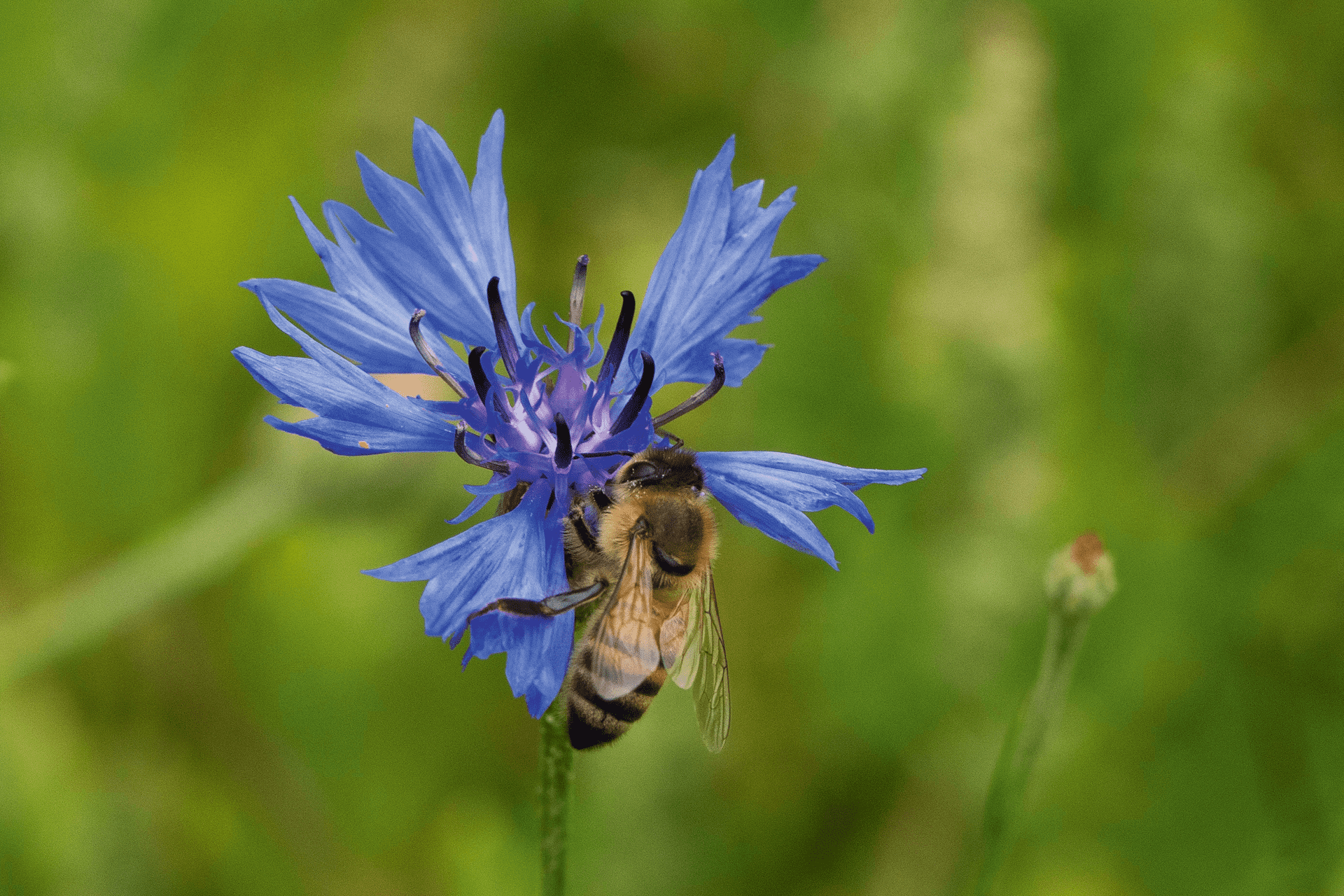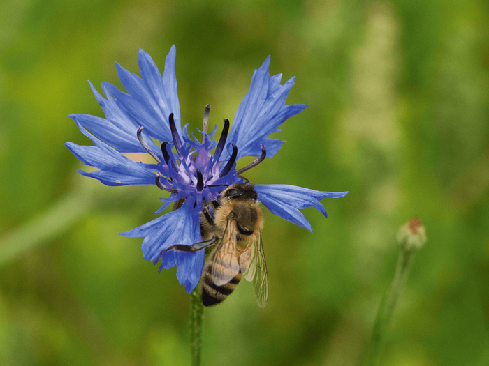 Kornblomst, Centaurea cyanus – Enårig, hjemmehørende plante. Blå blomster. Egner sig til buketter og også til tørring. Blomsterne er spiselige.