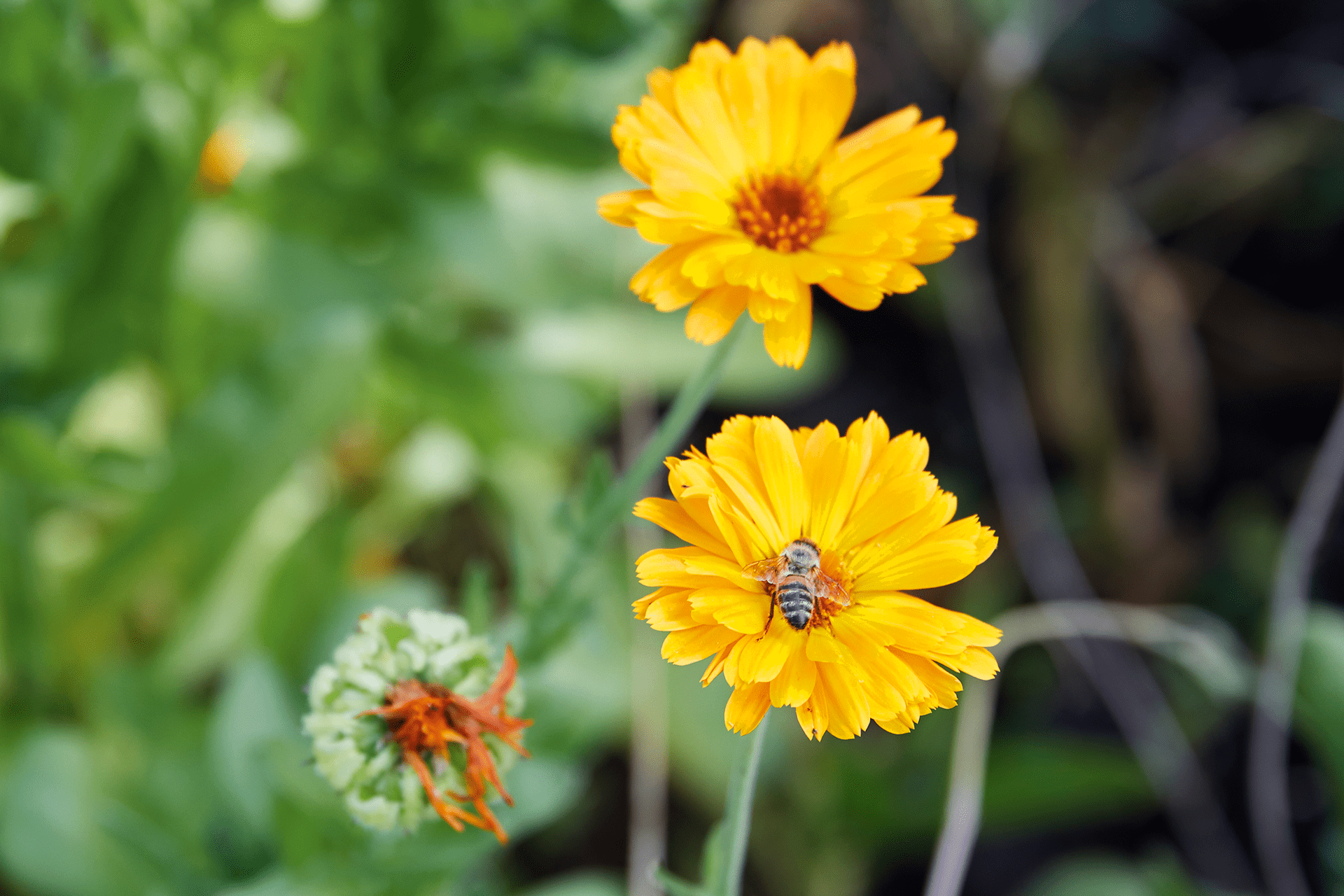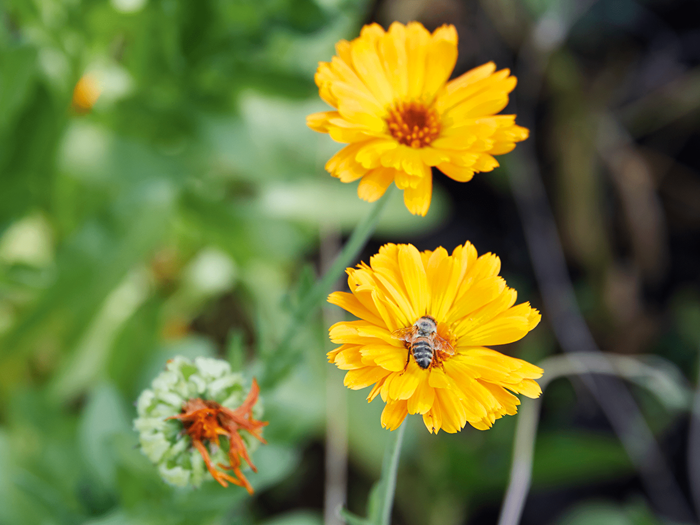 Morgenfrue, Calendula officinalis – Enårig sommerblomst med lysende orange blomster. Blomstrer helt til frosten kommer, hvis de visne fjernes løbende. God til buketter. Blomsterne er spiselige.