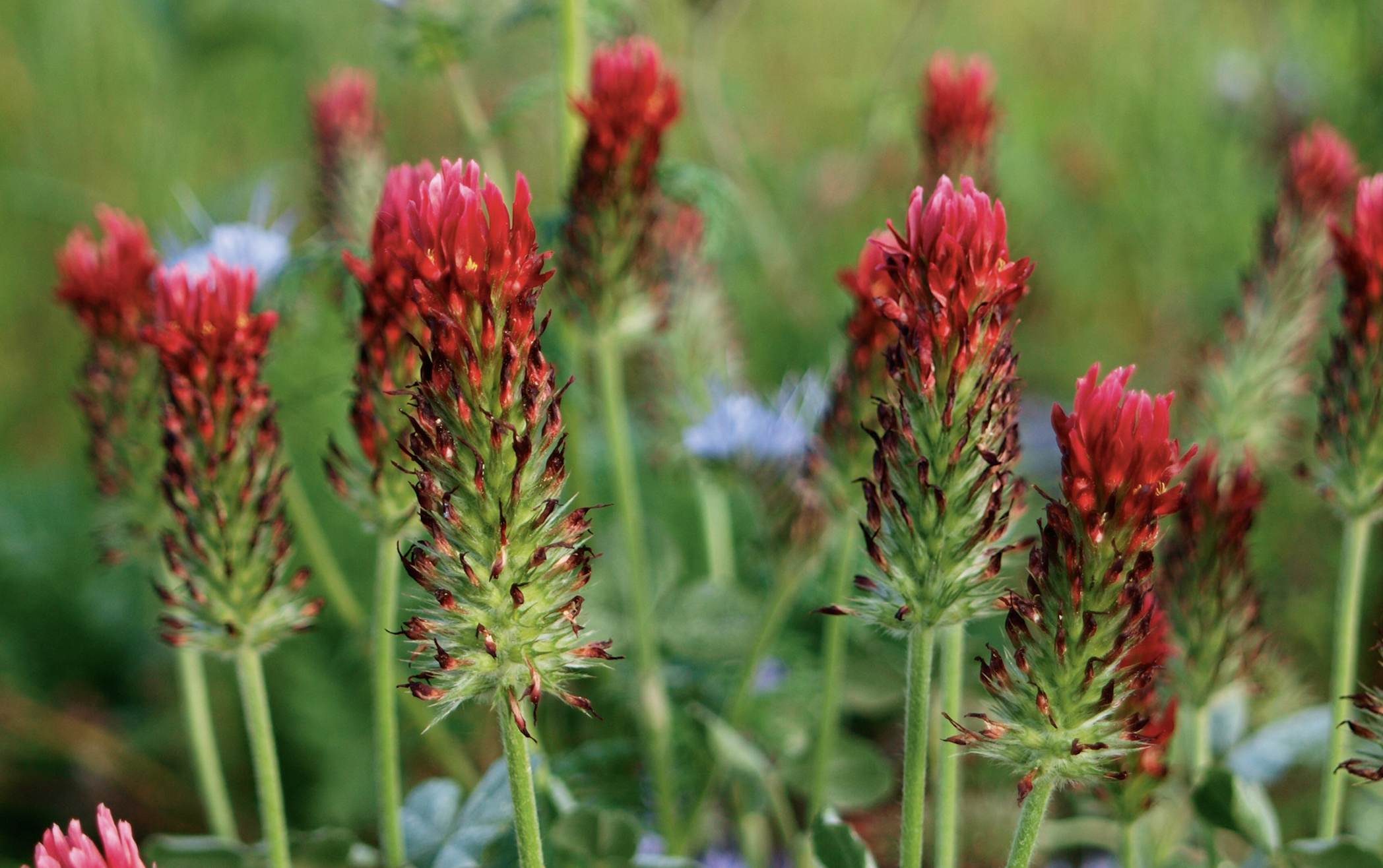 Blodkløver, Trifolium incarnatum – Enårig kløver med røde blomster. Anvendes som grøngødning.