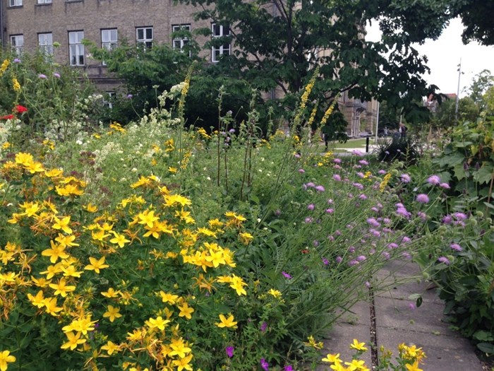 Foto ovenfor tv.: Hjemmehørende arter integreret i staudeanlæg, Rolighedsvej, Frederiksberg (MCB 2015)