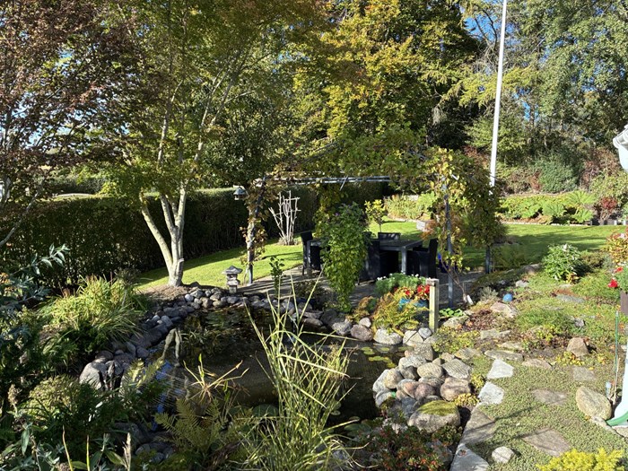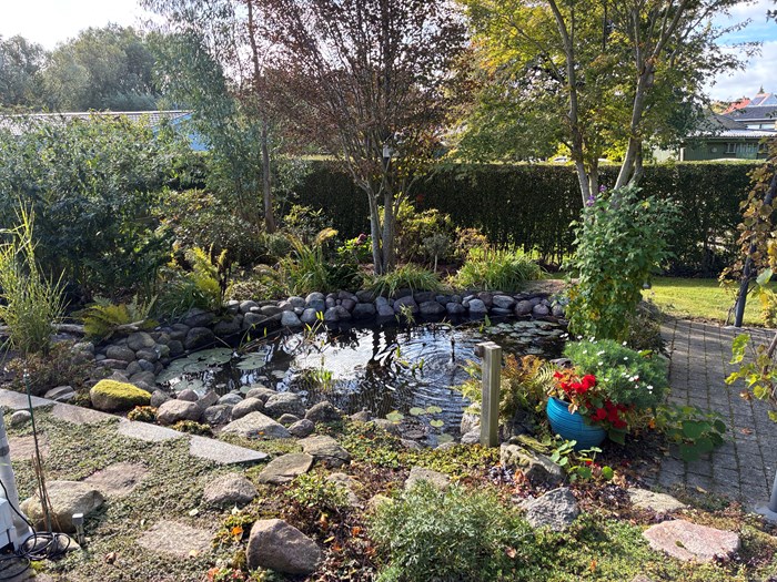 Naboen Henrik vil også gerne vise sin have frem. Den er bygget op omkring en lille havedam omkranset af forskellige bede med små buske samt bunddække - der er også blevet plads til nogle Højbede