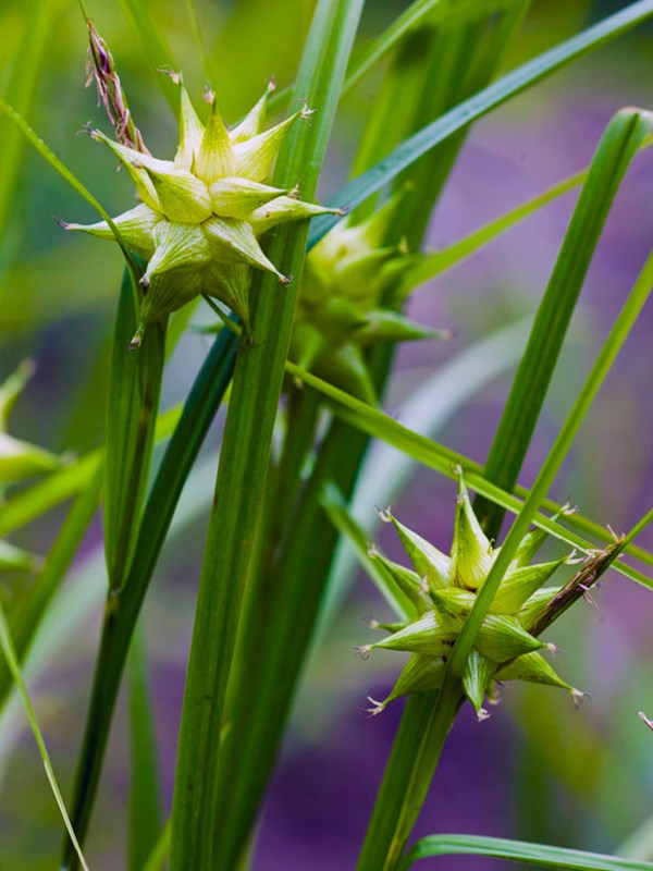 I bedet her står blandt andre den markante græs morgenstjernestar, der har en karakteristisk stjerneformet top, og hamphjortetrøst, der danner højde midt i bedet, og som sammen med duehoved og kattehale danner en violet skala i sensommeren. Som bund i bedet er både storkenæb, løvefod og engnellikerod, og som markante lyse farveklatter spreder den gule daglilje sine blomster ud i løbet af sommeren.