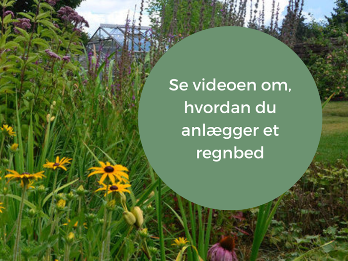 I videoen kan du se, hvordan du kan aflede regnvandet i et smukt regnbed. Regnbedet, som du kan se i videoen, ligger i en have i Vester Såby, hvor haveejeren lægger vægt på, at hensynet til havens dyreliv og vilde planter går hånd i hånd med brugen af regnvand.
