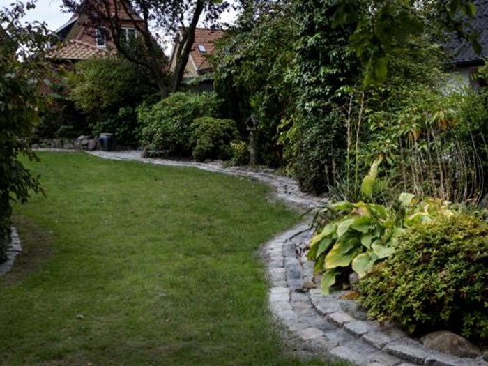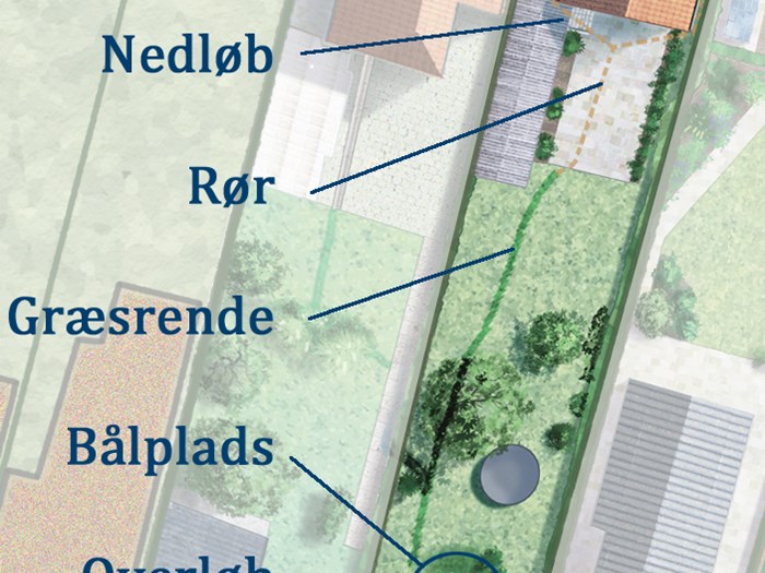 Når du laver en regnvandsløsning i din have, skal vandet fra husets tag og belagte overflader ledes, til f.eks. et regnbed, en forsænkning i græsplænen eller en faskine.