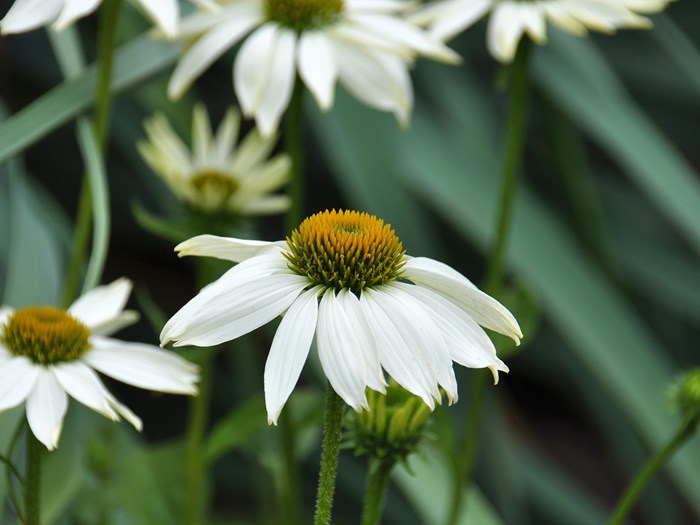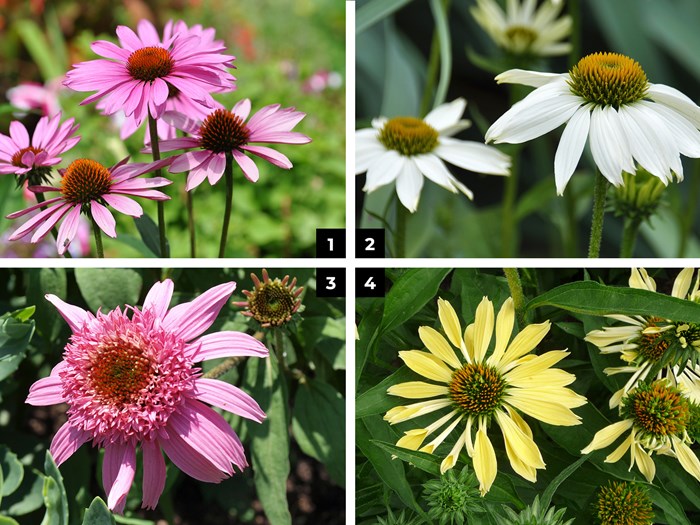 Echinacea purpurea (1), Echinacea purpurea 'White Swan' (2), Echinacea purpurea, 'Pink Double Delight' (3), Echinacea purpurea 'Sunrise' (4).