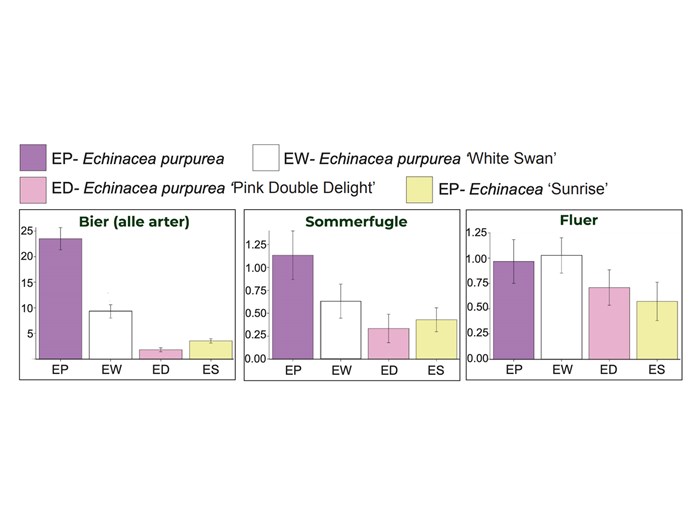 Grafikken ovenfor viser optællingen af insekter på de fire forskellige planter. Her ses det tydeligt, at den oprindelige art af purpursolhat er langt mere populær hos insekterne, end de øvrige. Det er især bier, der besøger blomsterne og undersøgelserne viser, at det især er humlebier (Bombus sp.), der har besøgt blomsterne, mens andre vilde bier og honningbier har været knapt så talrige.