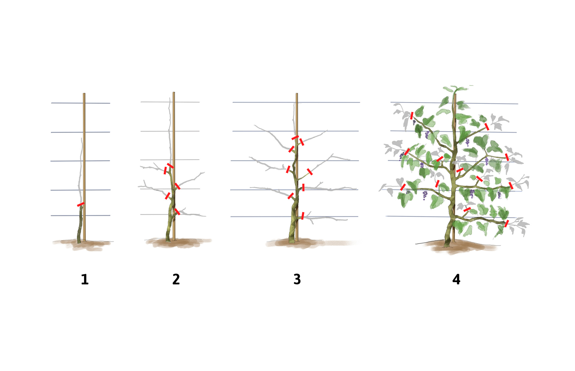 Knopperne bliver til nye sideskud hver sommer, som bindes til trådene. Når hovedstammen ikke giver så mange druer mere, klippes den ned, og man starter forfra.