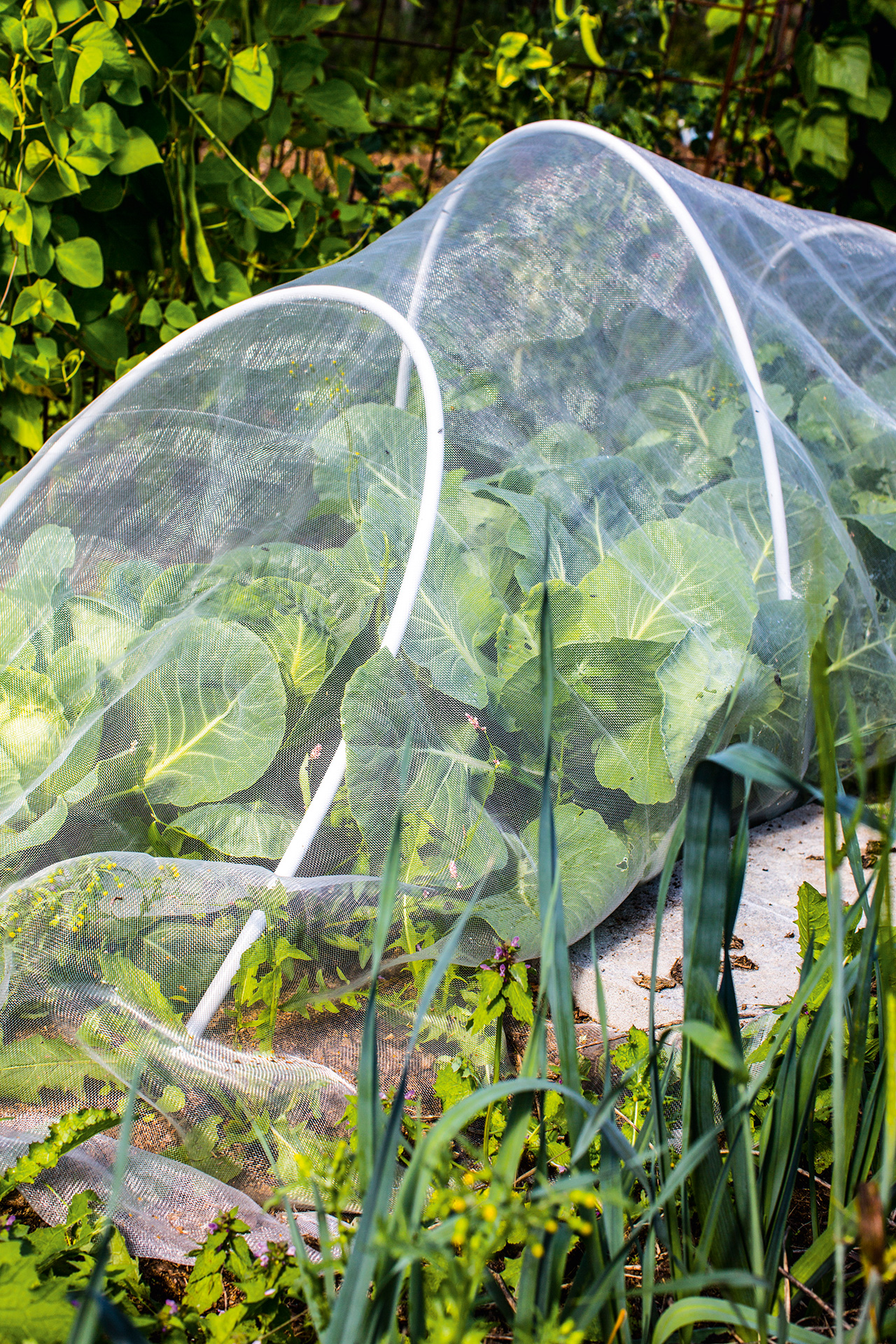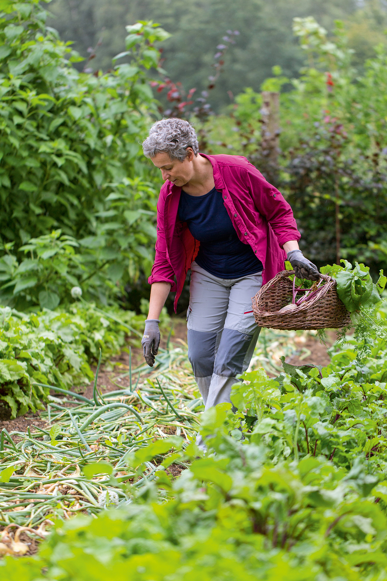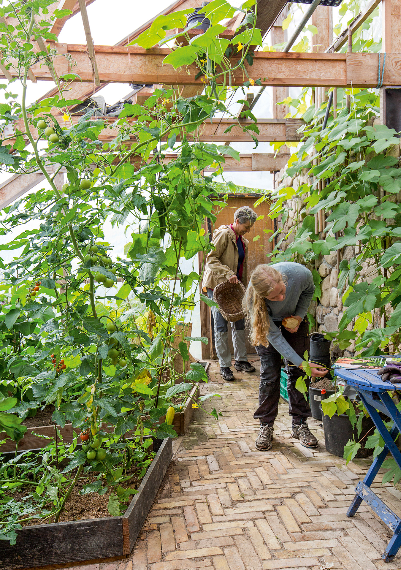 De har tidligere haft problemer med gulerodsfluer og kålsommerfugle, men efter at de er begyndt at lægge net over de udsatte afgrøder, har de fået en mærkbart bedre høst. Ud over den store køkkenhave har familien også grise, får og masser af frugt og bær. Dermed er de næsten selvforsynende: