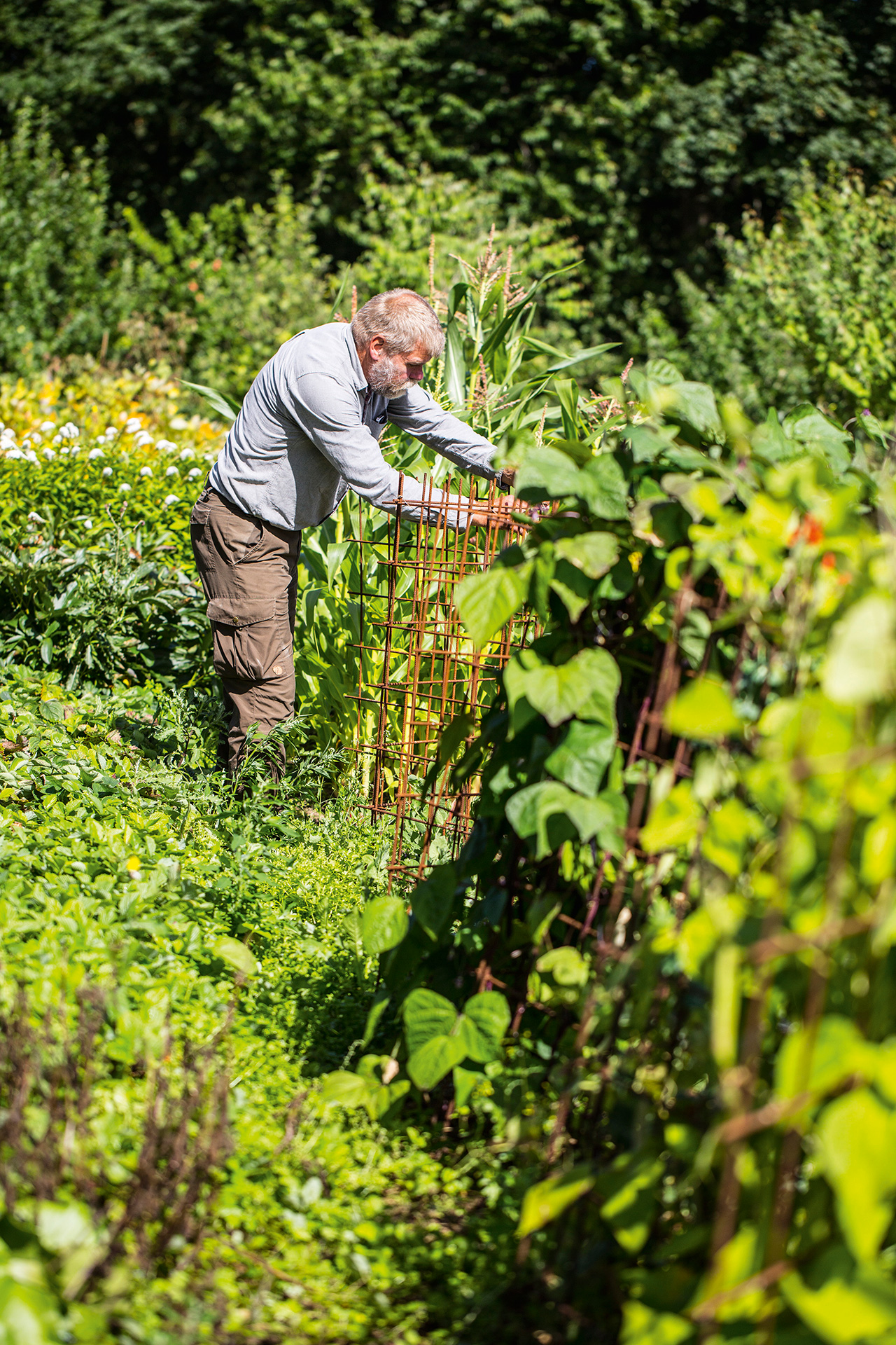 »Som du kan se, så kan jeg komme pænt langt ned bare med en hånd. Det er jo løs jord. Det er jo det, der er glæden, når vi for eksempel trækker pastinakker op.« Omkring ham ligger den store køkkenhave i en lysning mellem træerne. Bedene med den utrolig porøse jord ligger i meget lange rækker ved siden af hinanden. De er til gengæld ikke bredere, end man kan skræve over dem, og det gør det nemt at færdes i køkkenhaven uden at træde på dyrkningsjorden. Og det er et af hovedprincipperne bag gravefri køkkenhave, eller no-dig metoden, som Bo er en varm fortaler for.