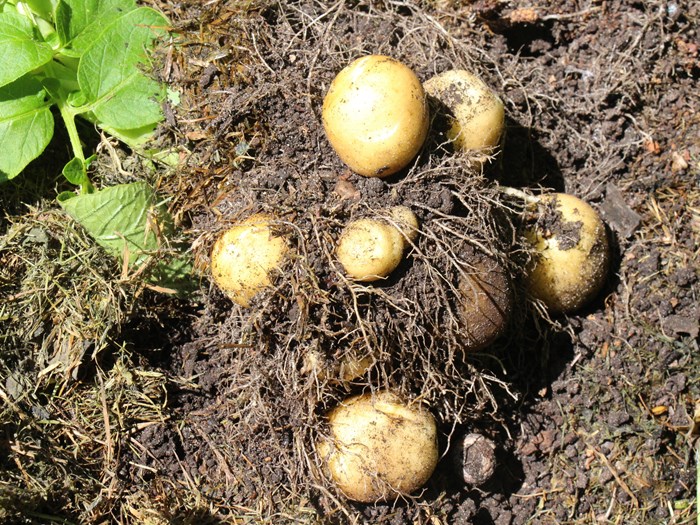På grundlovsdag kunne der høstes nye kartofler i Bed3. Jeg har ellers været en smule spændt på, hvor mange der var på dette tidspunkt, da de blev lagt et par uger senere end normalt på grund af kulde og frost i starten af april. Godt et halvt kilo på to planter blev det dog til - og dermed et festligt bidrag til frokosten på “demokratiets festdag”. Og da de blev høstet, var det tydeligt at se, hvorfor kartofler skal hyppes - eller som i dette tilfælde få lagt et tykt lag græsafklip mellem rækkerne. Lige under græslaget havde flere knolde gennembrudt jordoverfladen, og hvis de ikke havde været dækket, var de blevet grønne og uspiselige af sollyset.