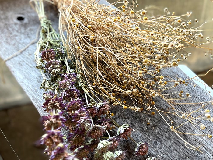 Hvis man tørrer blomsterhoveder som kamille, kan man enten hænge hele planten op og klippe blomsterhovederne af, når de er tørre, eller man kan tørre blomsterhovederne uden stængel på et stykke avispapir og røre rundt i dem en gang imellem.