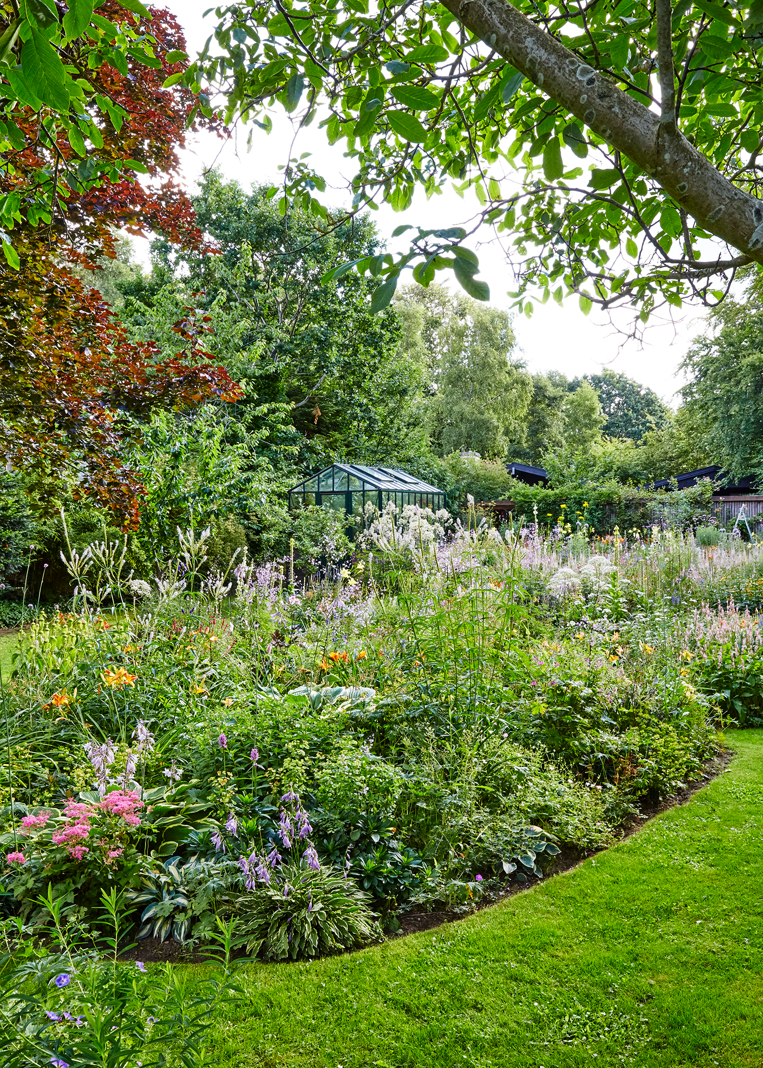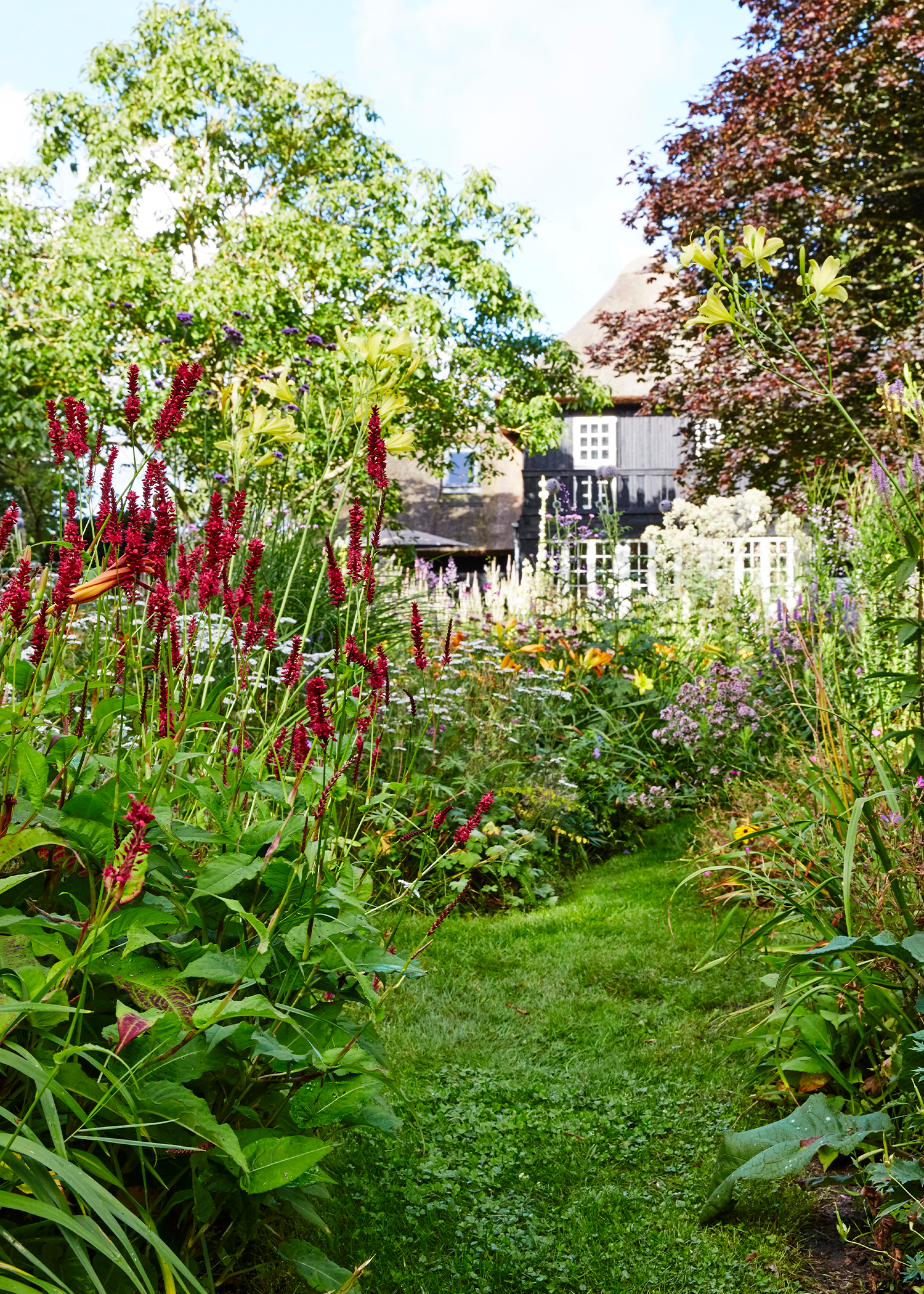 Havedesigneren har derfor store, blå driver af pragtstorkenæb ned igennem haven. De blomstrer i juni, mens udtrykket ændrer sig i juli til bølger af hvidt og gult med kongelys. »Det er vigtigt, at bedet opleves som en helhed og ikke fragmenteret. Det er det væsentligste designelement, vi lærer af at iagttage naturen,« fastslår han.