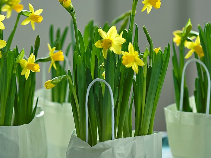 Vælg små gule tete-a-tete påskeliljer, og skjul potterne i hvide papirsposer, som kan købes i mange gave- og hobbybutikker. Eller vælg evt. en anden slags urtepotteskjuler.