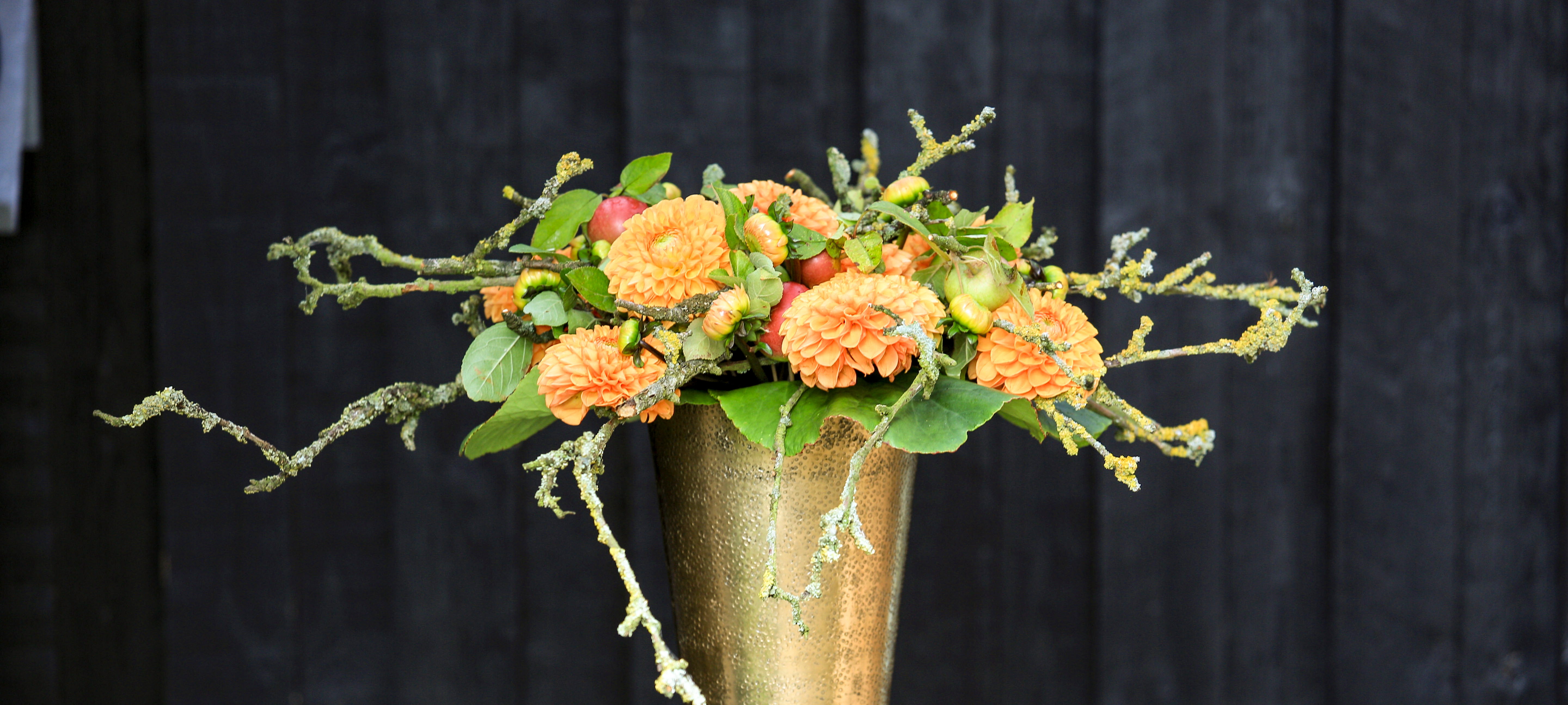 Påfugledekoration lavet af hængebirk med plads til en krukke i midten til blomster. En dekoration, som kan flyttes rundt i haven.