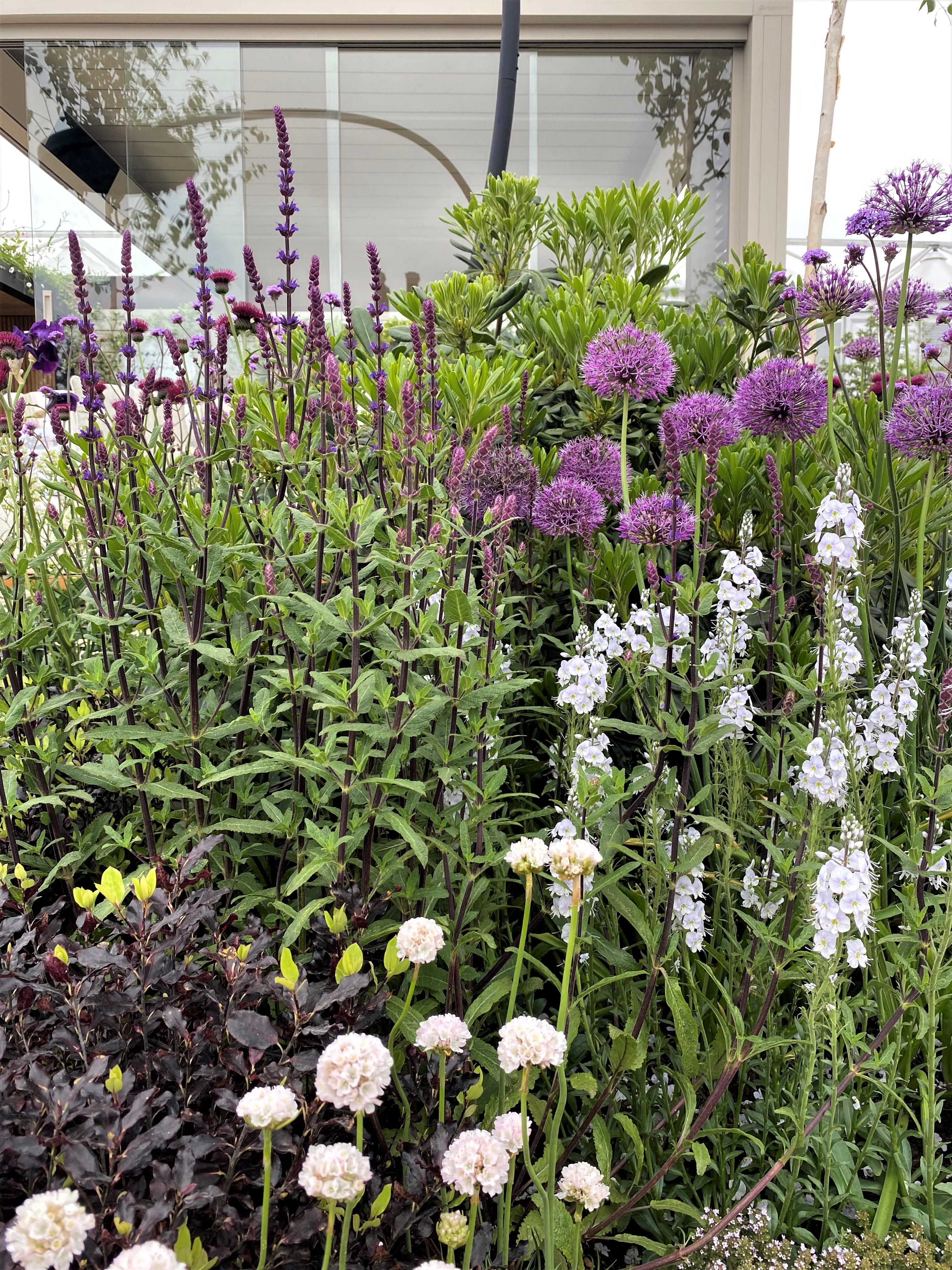 Hvert år er der på Chelsea nogle farver som går igen. I år er ingen undtagelse. Det er især farven lilla i kombination med hvid, der er meget populær. Nogle steder er de hvide blomster i kombination med mørke magenta eller vinrøde blomster. Også pastelfarver er noget der kommer mere frem. Lyserøde og blå bloster i kombination med gråløvede planter.