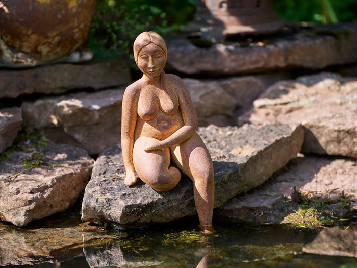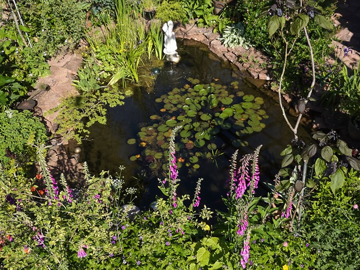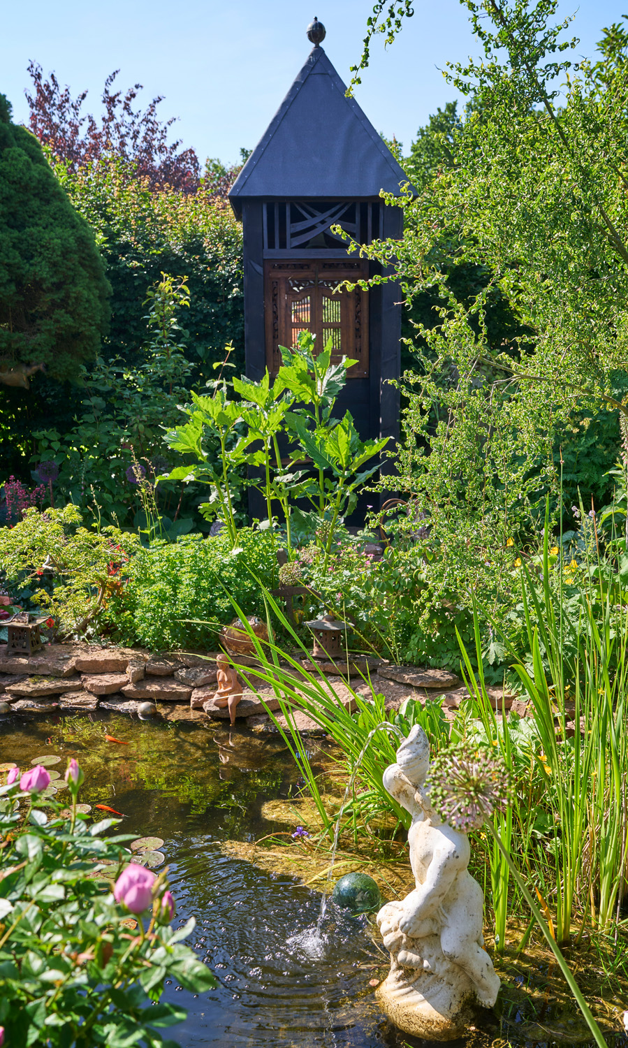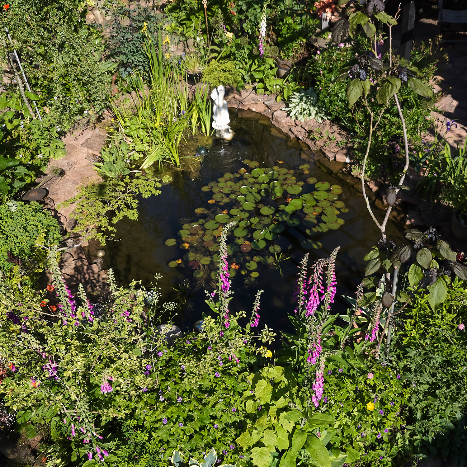 Både den hvide springvandsfigur og guldfiskene er gaver. Selvom der er fisk i dammen, er her også både frøer og vandsalamandre. Fiskene behøver kun en smule supplerende foder, og det er måske forklaringen på at algevæksten er begrænset.