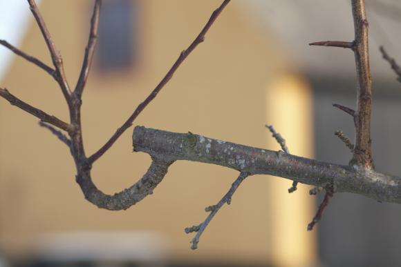 På billedet ses et eksempel på, hvad der sker, når man klipper en mindre gren over ved et skud, der vender den forkerte vej.