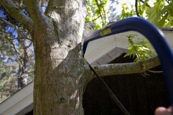 Skal du fjerne en stor, tung gren, er det bedst at gøre det i tre trin, så barken ikke bliver revet af, når grenen falder.