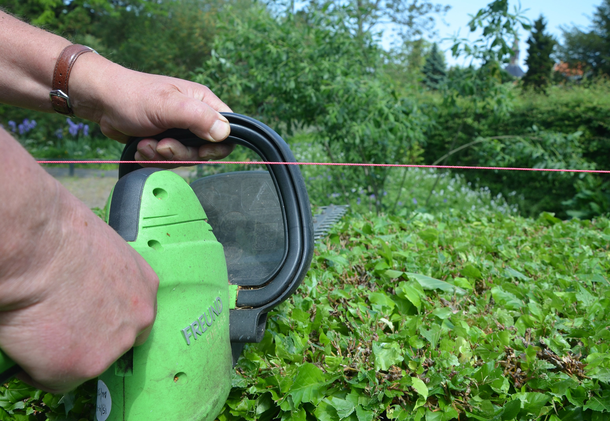 En vandret snor er en stor hjælp. Den skal ikke spændes ud i den højde du gerne vil have, hækken ender på, men et stykke over, så du ikke risikerer at klippe den over under arbejdet.
