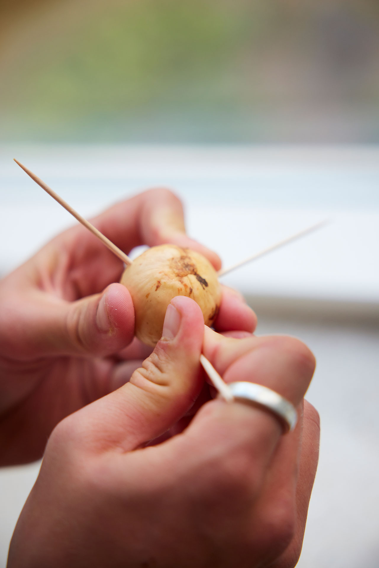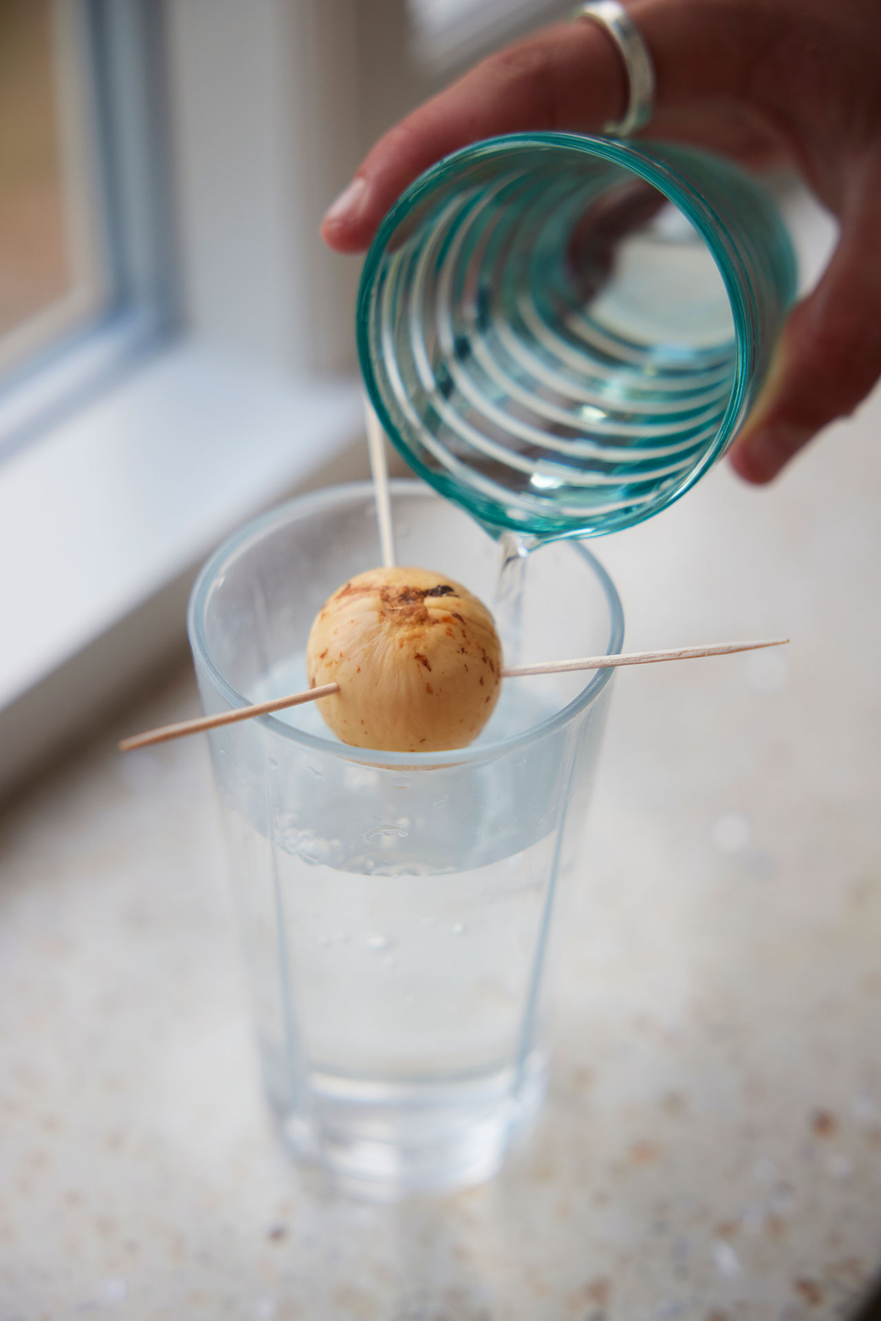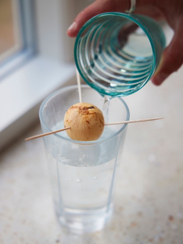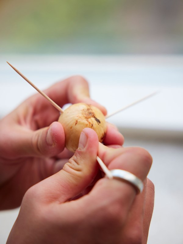 3. Stik tre tandstikker ind i kernen og lad den hvile på kanten af et glas med vand.