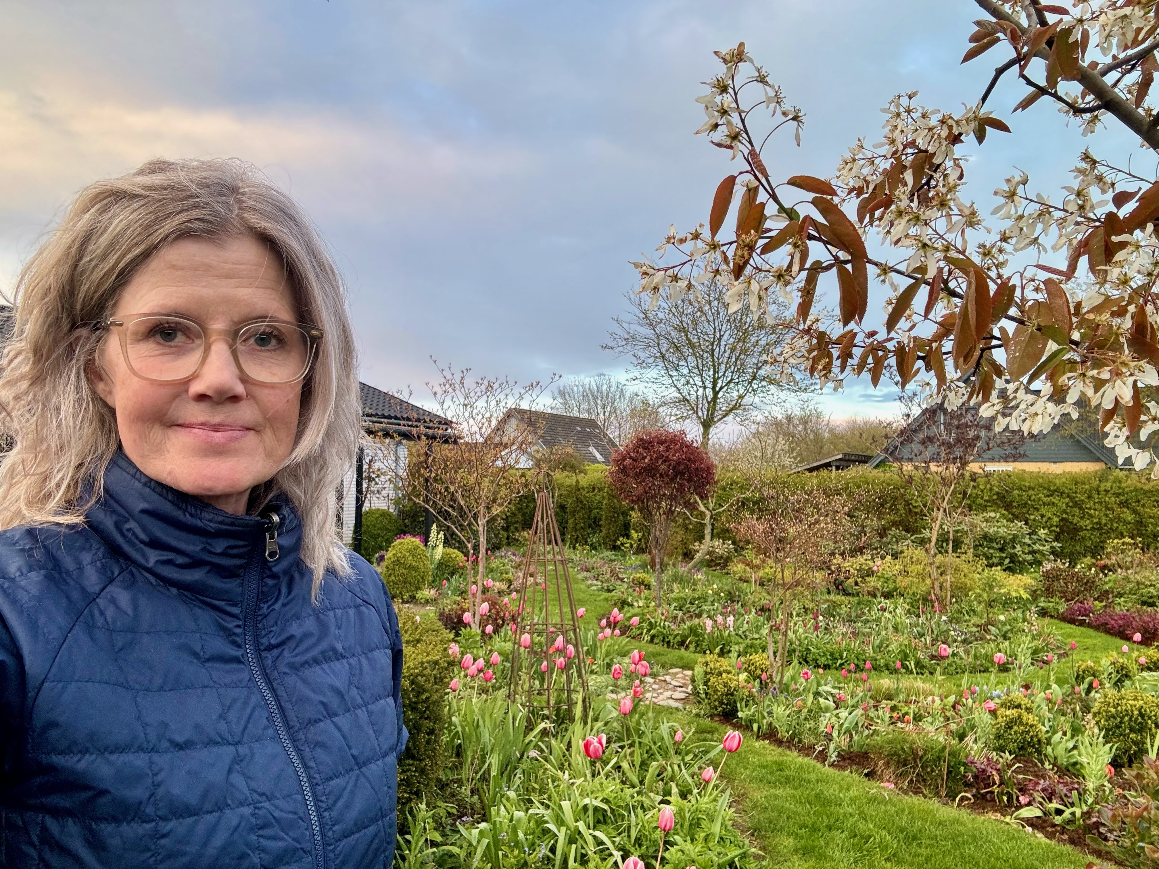 Christina Wejlemann i sin have en forårsdag. Sidste år åbnede hun sin have for første gang, og det var lidt grænseoverskridende, men gik rigtig godt. Foto: Privat