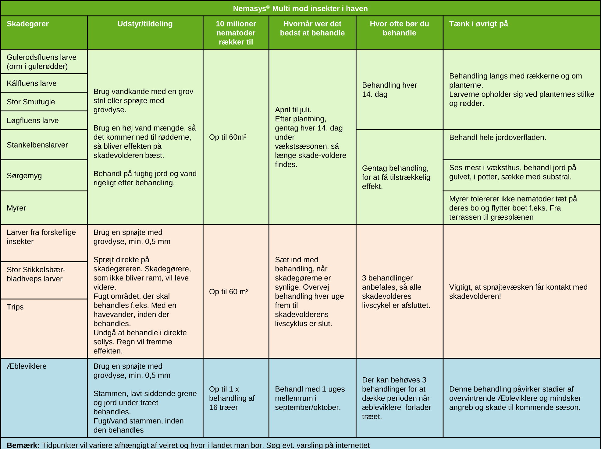På nedenstående skema kan du se, hvornår og hvordan du sætter ind over for de forskellige skadevoldere på de forskellige afgrøder. Du kan også læse mere på www.nemaslug.dk.