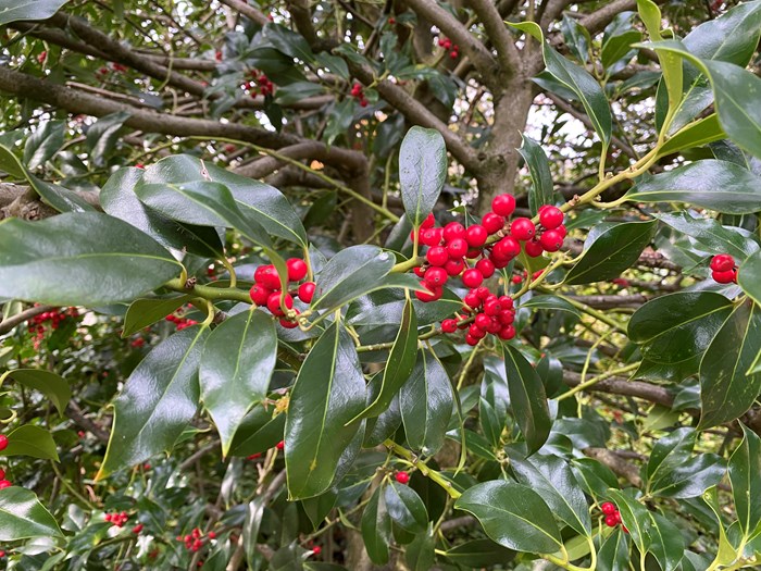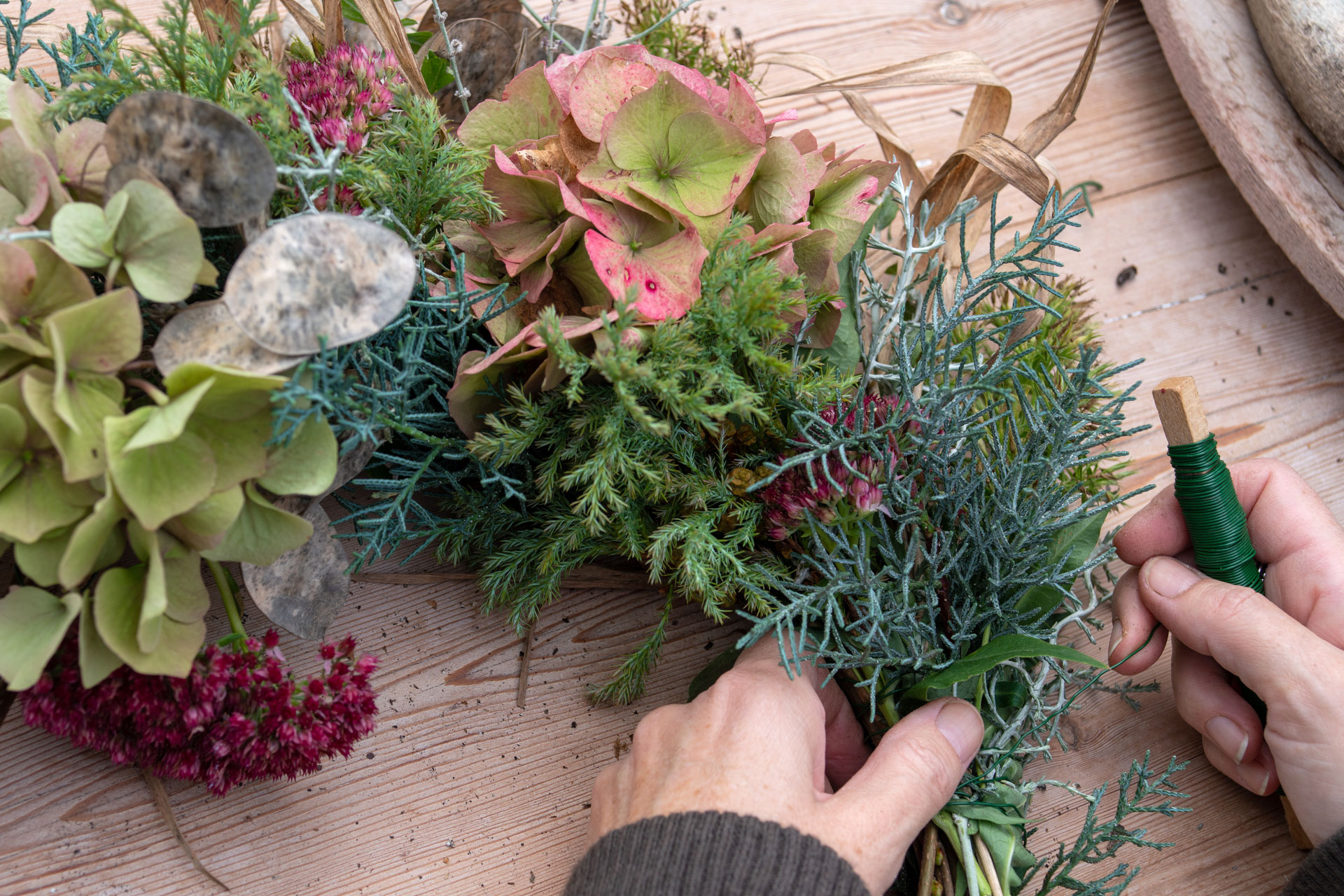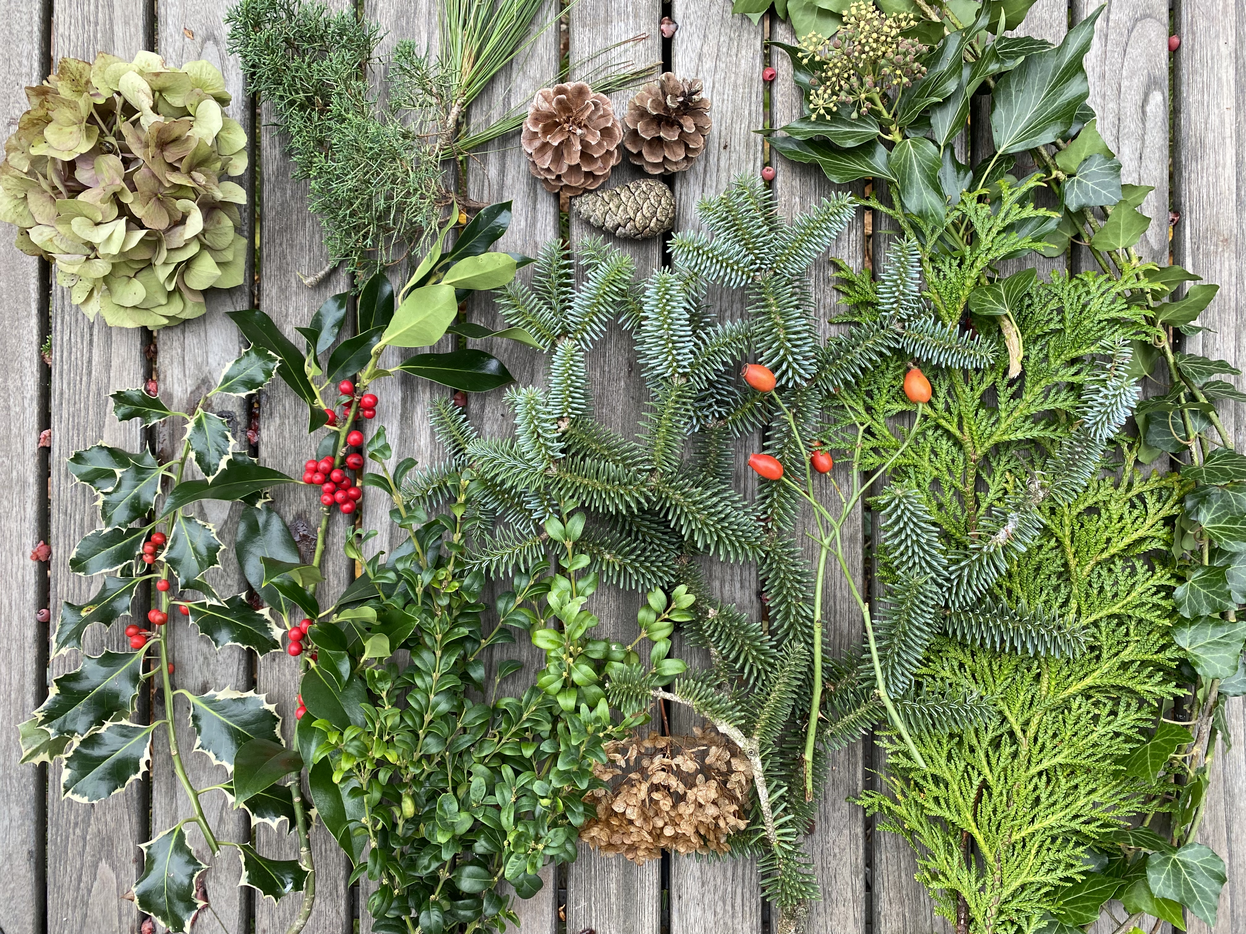 Hent pynt til dekorationer i haven – der er mange flere muligheder, end du formentlig aner. Er du heldig at have kristtorn med bær på grenene, så klip grenene af. De kan både bruges til dekorationer og kranse eller kommes i kræmmerhus og hænges på juletræet. Tag hortensiaens blomterstande ind og lad dem tørre, se om der står stauder med tørre blomsterstande som kan bruges, eller måske der i nabolaget er et lærketræ med fine kogler. Har du vedbend med bær, kornel med smukke røde grene eller vilde roser med hyben, kan de også pynte – mulighederne er mange.