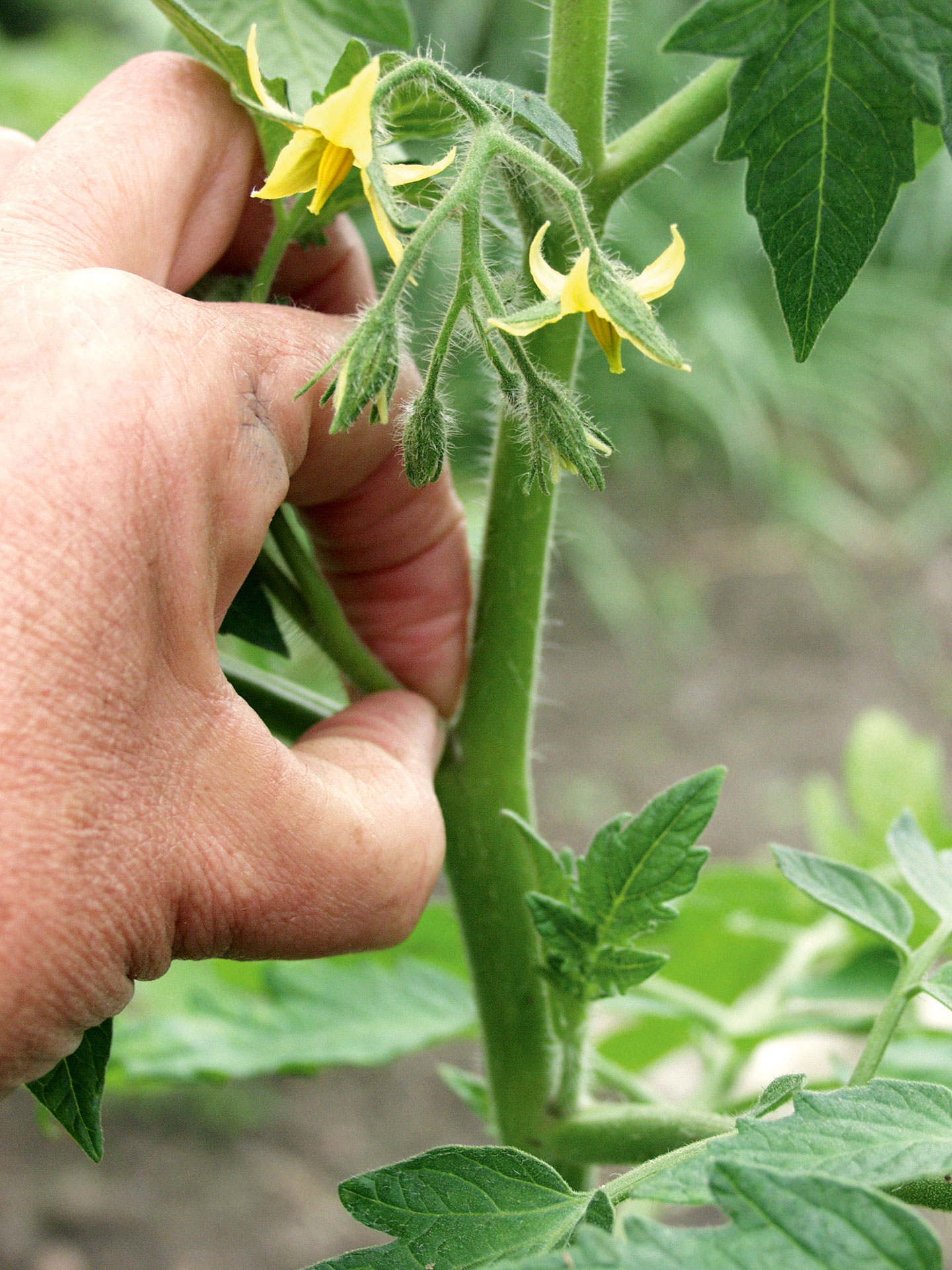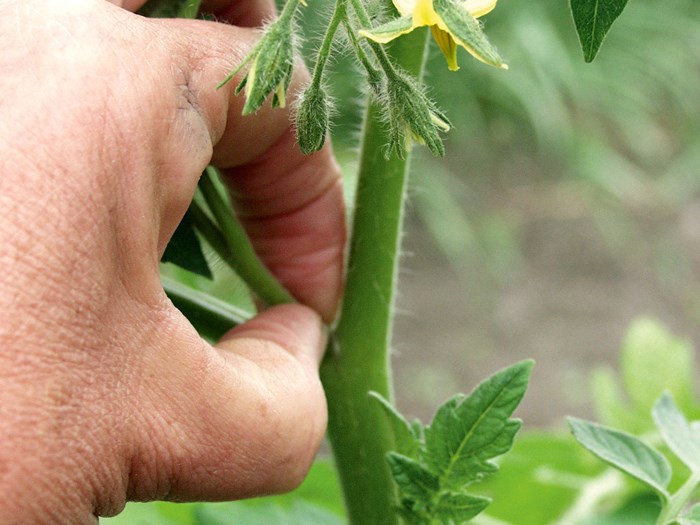Husk at tage sideskud på tomatplanterne. Det skal gøres løbende, men især i juli er der virkelig vækst i planterne. Vender du ryggen til dem i bare en uges tid, kan de hurtigt løbe fra dig. Mellem tomatplantens stamme og blade sidder de små, nye skud, som skal fjernes. Klip dem ikke, men nip eller bræk dem gerne af med fingrene. Fjerner du ikke de nye skud, danner de en ny top og laver en parallel plante, og det vil gå ud over udbyttet.