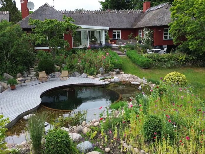 »Vi valgte en badesø bl.a. for det bæredygtige element i ikke at have klorvand. Der KAN selvfølgelig komme lidt alger i, og så falder der jo også nogle blade i, men lige i vores sø er det ikke overvældende, hvad vi har af vedligeholdelsesarbejde. Vores vigtigste rengøringsopgave er at fjerne nedfaldsmateriale, så det ikke formulder, og så luger jeg trådalger, der kan samle sig ved kanten. Det er ikke noget, der tager lang tid, men vi tager os af det, når vi ser det. Og endelig har vi tilkøbt en poolrobot, der går rundt nede på bunden og gør rent,« siger Lene Byskov og fortsætter: »Søen består af regnvand og haveslangevand. Man kan få søer med automatisk overløb og påtapning, men vi har valgt den manuelle løsning, og vi holder øje med vandstanden. Når en bestemt sten bliver dækket af vand, tager vi vand fra søen og vander rododendronerne grundigt, til vi kan se stenen igen. Når det er varmt, og vandet fordamper, så dukker stenen frem, og så lægger vi haveslangen i filteret, så vi kan få toppet op med vand, til stenen er dækket.«