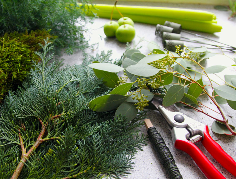 3. Klip dernæst små buketter af ædelcypres, kransecypres og eucalyptus. Jeg har her klippet dem i 6-8 cms længde til denne krans.