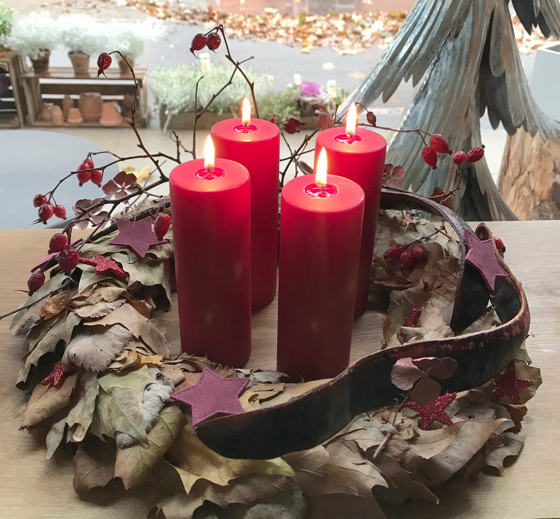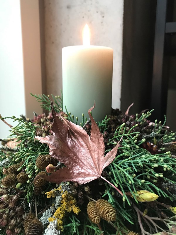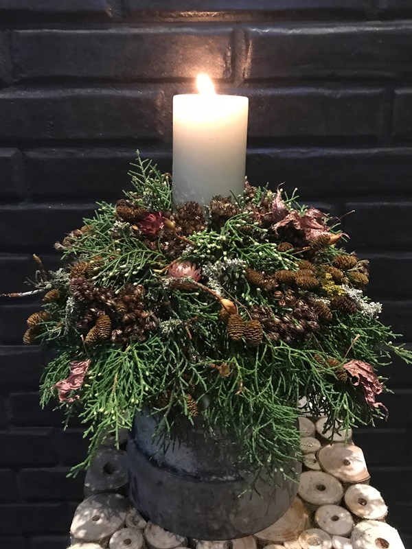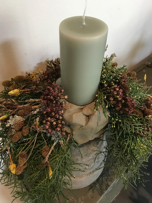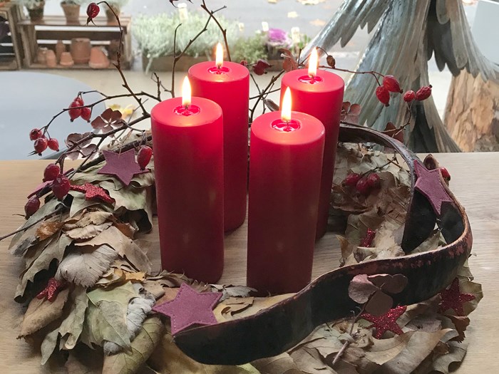 3. Placer de 4 høje bloklys i midten af kransen. Et fad kan evt. Placeres nedenunder for at undgå dryppende stearin.