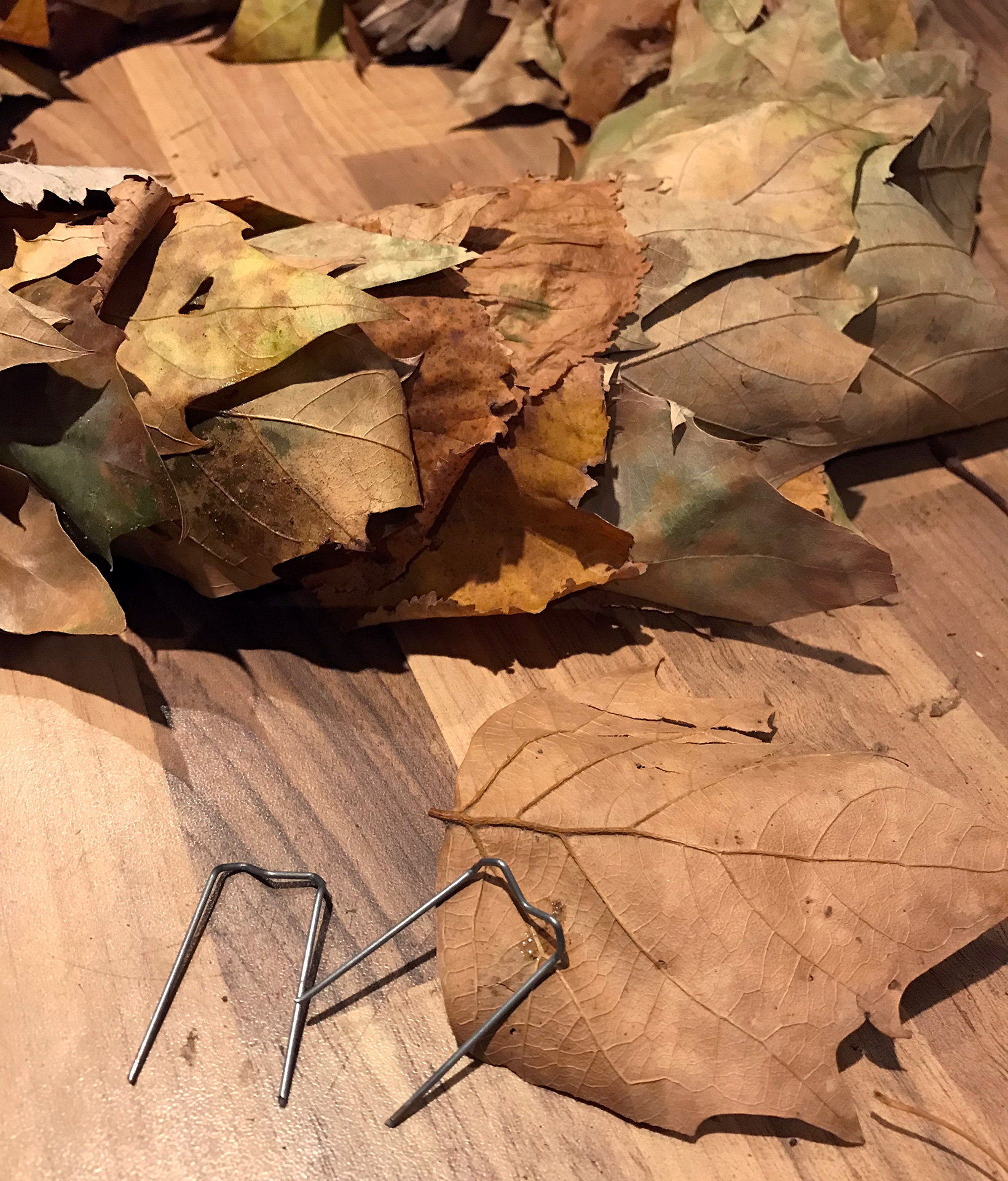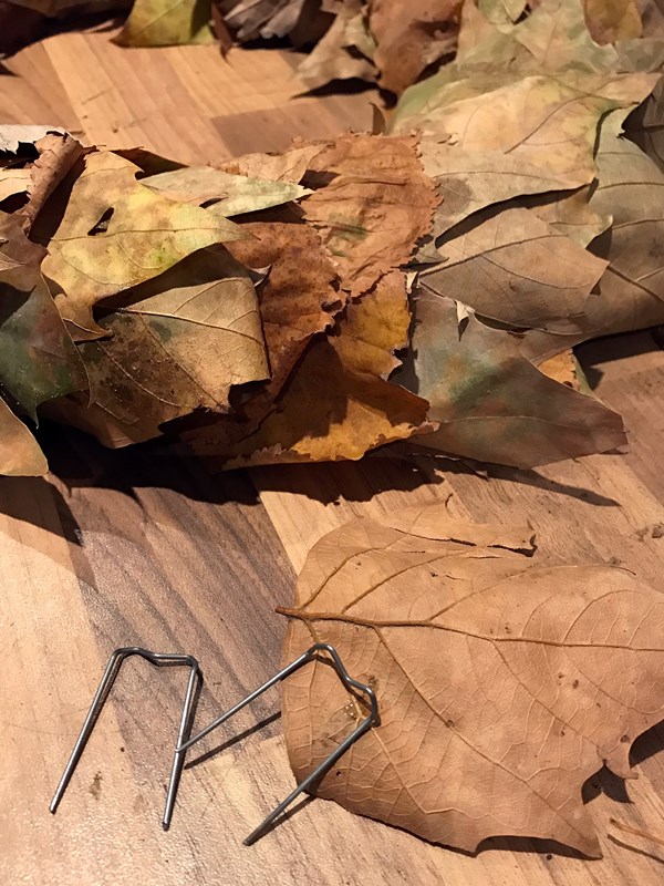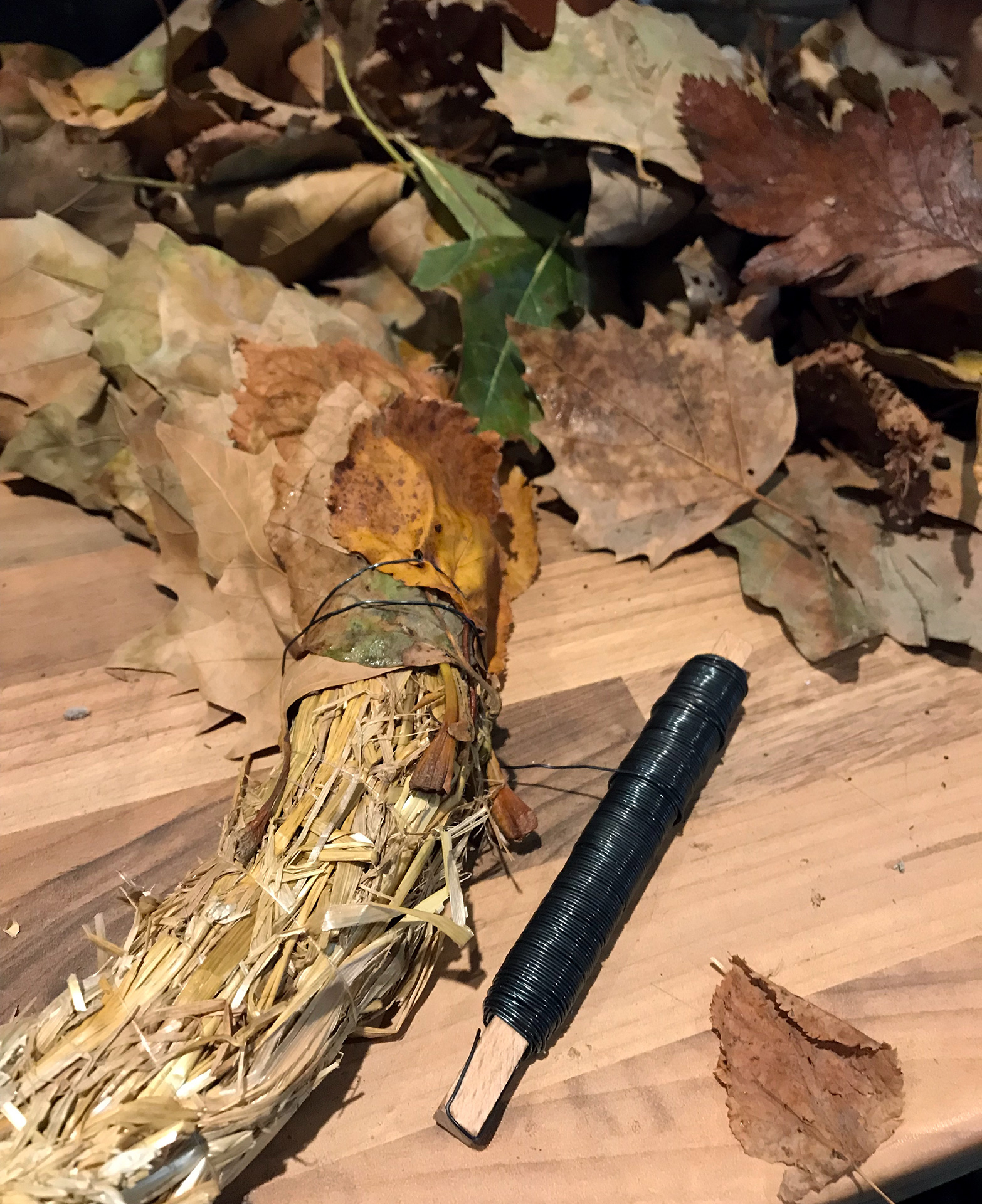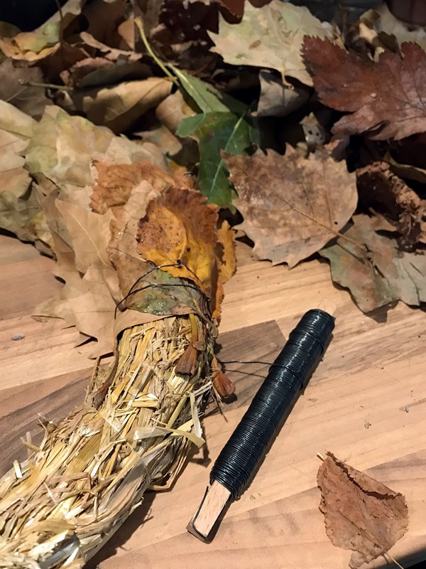1. Bind kransen med dine løvblade. Husk at binde med rigeligt løv så du undgår huller ved tørring.