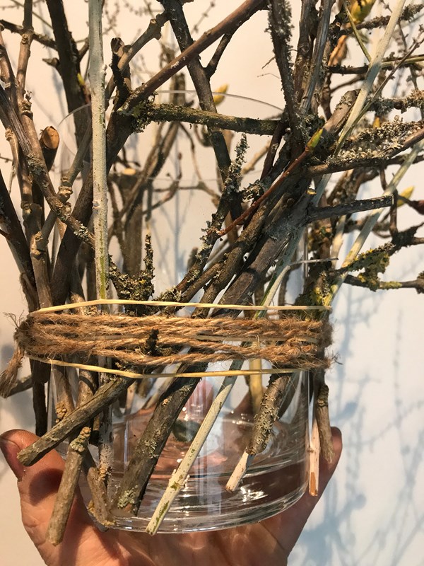 1. Sæt 3 elastikker omkring vasen, isæt herefter de længste grene og frøstande. Herefter de mindre og forsøg at skubbe grenene udad – væk fra lysets varme.