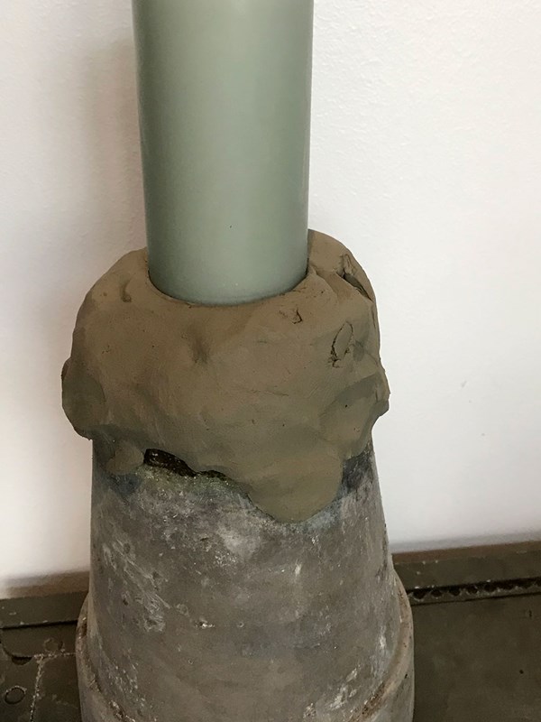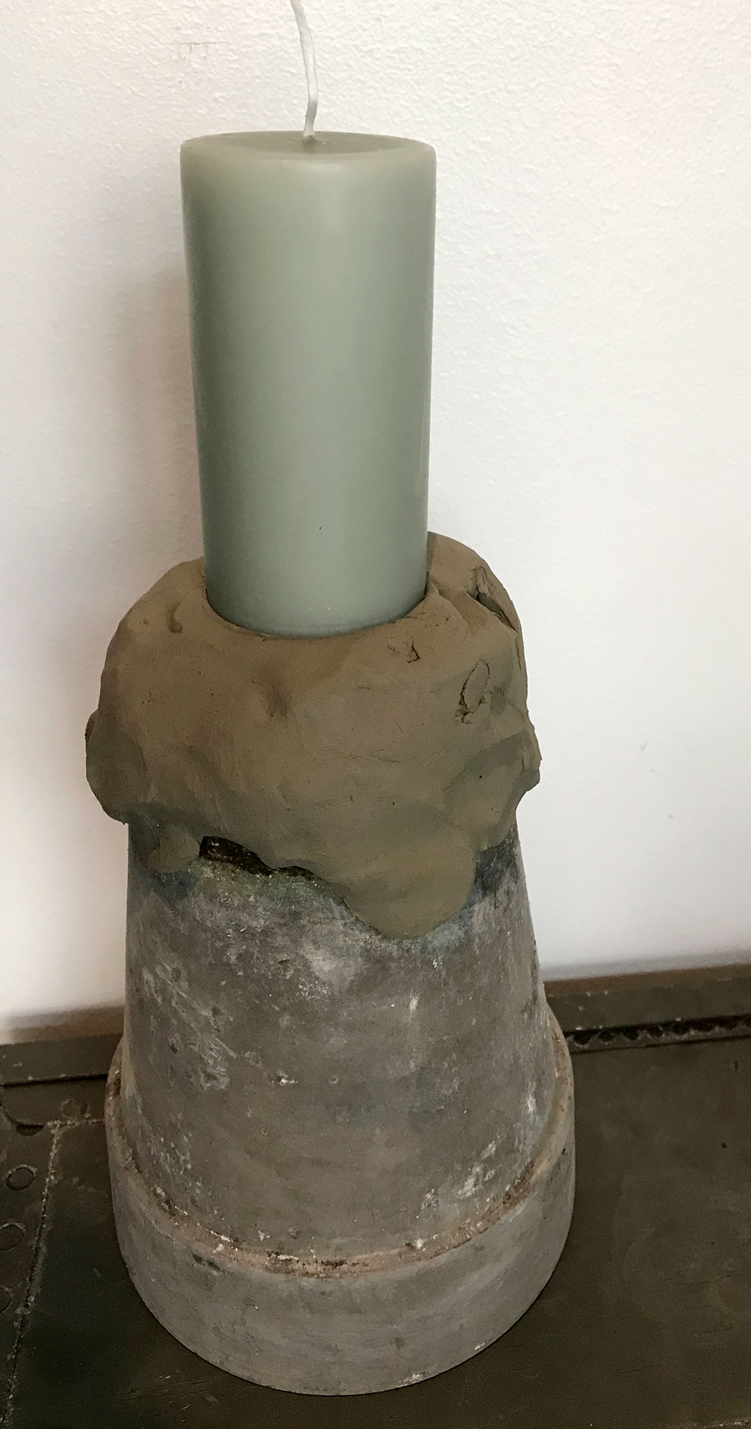 1. Vend krukken på hovedet, læg ler på toppen og form leret rundt med lidt ned af siderne – på den måde vil leret ikke glide af ved tørring. Placer lyset i midten.